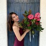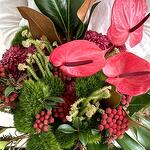 Brunia - 5 шт. Ribbon - 1 шт. Anthurium - 3 шт. monstera - 1 шт. skimmia - 3 шт. dianthus green trick - 6 шт. magnolia - 2 шт. blad chamaerops - 4 шт.