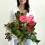 Composition: Magnolia - 2, Anthurium - 3, Monstera - 1, Skimmia - 3, Dianthus Green Trick - 6, Brunia - 5, blad chamaerops - 4, ribbon - 1 Sizes: WIDTH - 35CM; HEIGHT - 50CM; LENGTH - 50CM; (including packaging) Размер: 35 x 50 x 50 см