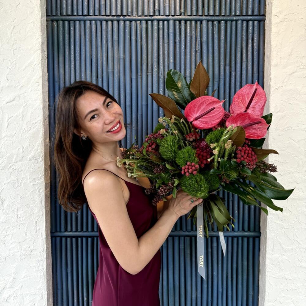 Brunia - 5 шт. Ribbon - 1 шт. Anthurium - 3 шт. monstera - 1 шт. skimmia - 3 шт. dianthus green trick - 6 шт. magnolia - 2 шт. blad chamaerops - 4 шт.