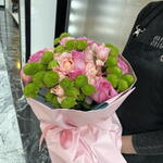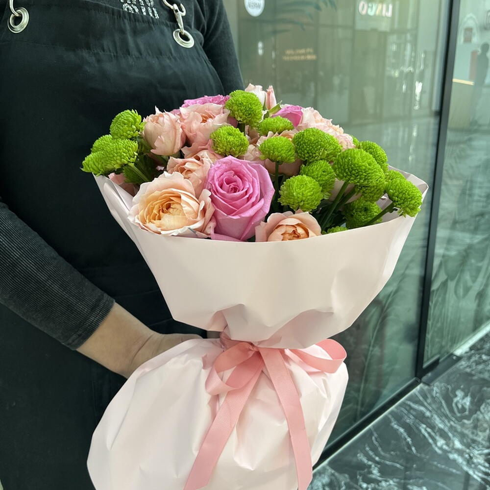 Composition: Chrysanthemum Santini - 7, Spray Rose Julieta peach - 7, pink rose - 7 Sizes: WIDTH - 30CM; HEIGHT - 50CM; LENGTH - 50CM; (including packaging) Размер: 30 x 50 x 50 см