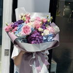 Composition: Hydrangea - 7, Rose White Ohara - 5, Rose Pink Ohara - 5, Lisianthus - 8, Chrysanthemum Momoko - 2, Peony Sarah Bernhardt - 1 Sizes: WIDTH - 50CM; HEIGHT - 65CM; LENGTH - 65CM; (including packaging) Размер: 50 x 65 x 65 см