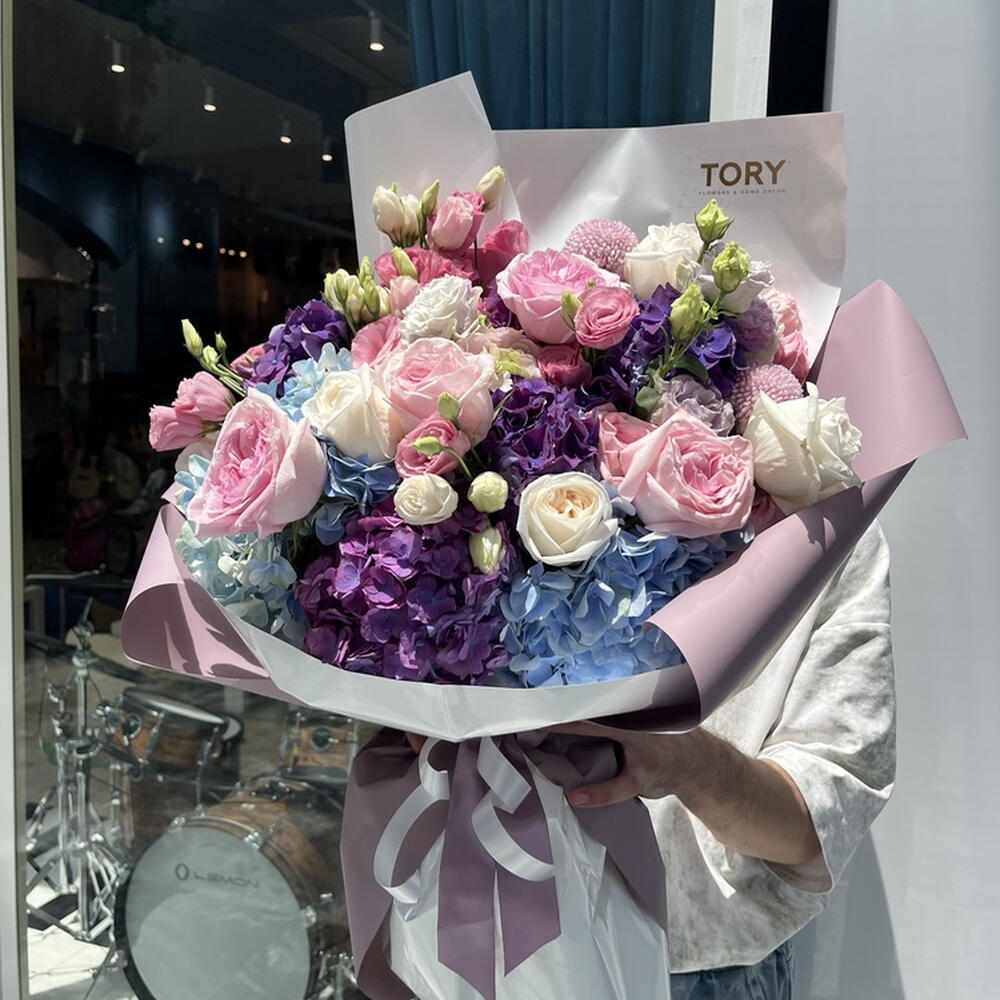 Composition: Hydrangea - 7, Rose White Ohara - 5, Rose Pink Ohara - 5, Lisianthus - 8, Chrysanthemum Momoko - 2, Peony Sarah Bernhardt - 1 Sizes: WIDTH - 50CM; HEIGHT - 65CM; LENGTH - 65CM; (including packaging) Размер: 50 x 65 x 65 см