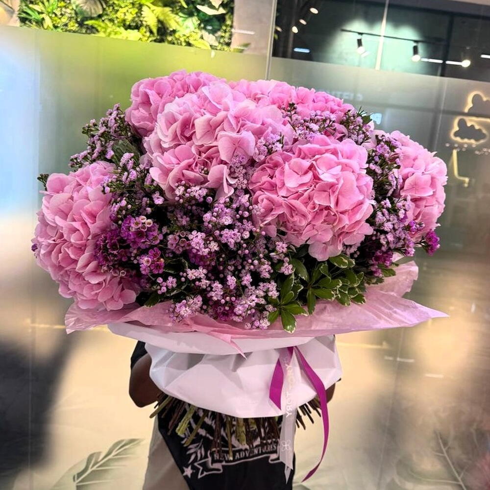 Composition: Hydrangea - 9, Chamelacium - 50, Pittosporum - 7 Sizes: WIDTH - 60CM; HEIGHT - 60CM; LENGTH - 60CM; (including packaging) Размер: 60 x 60 x 60 см