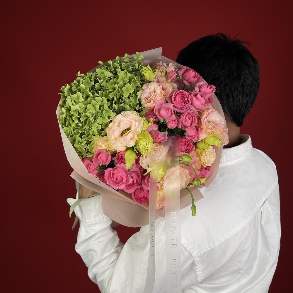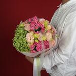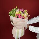 Потрясающее сочетание пышных зелёных гортензий, нежных розовых роз и нежно-персиковых эустом создаёт умиротворяющий персиково-розовый оазис. Этот прекрасный букет пробуждает чувство спокойствия, радости и нежной привязанности, что делает его идеальным подарком на день рождения, День матери, в качестве трогательного жеста, чтобы поздравить кого-то или просто поднять кому-то настроение.
