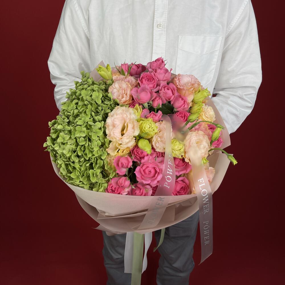 Оазис персикового румянца: смешанный букет из зелёной гортензии, розовых роз и персиковых эустом