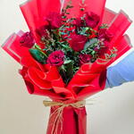 Этот потрясающий букет из бархатистых красных роз, пропитанный романтикой, воплощает самую суть любви и преданности. Каждый цветок отобран вручную за насыщенный цвет и идеальную форму, подчеркнутую свежей зеленью, создающей естественный контраст. Упакованный в роскошную красную бумагу и перевязанный грубой рафией, он сочетает в себе элегантность и лёгкое деревенское очарование. Лепестки, покрытые росой, придают букету вид только что собранного букета, делая его захватывающим подарком на любой романтический случай. Будь то День святого Валентина, годовщина или спонтанный жест привязанности, этот букет оставит неизгладимое впечатление. Пусть ваше сердце говорит через цветы с этой вневременной композицией.