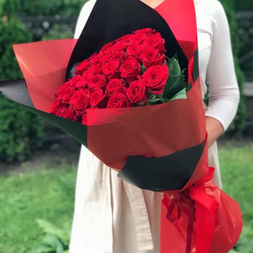 Composition: rose red - 35, Wrapped - 4, Ribbon - 2 Sizes: WIDTH - 40CM; HEIGHT - 65CM; LENGTH - 65CM; (including packaging) Размер: 40 x 65 x 65 см