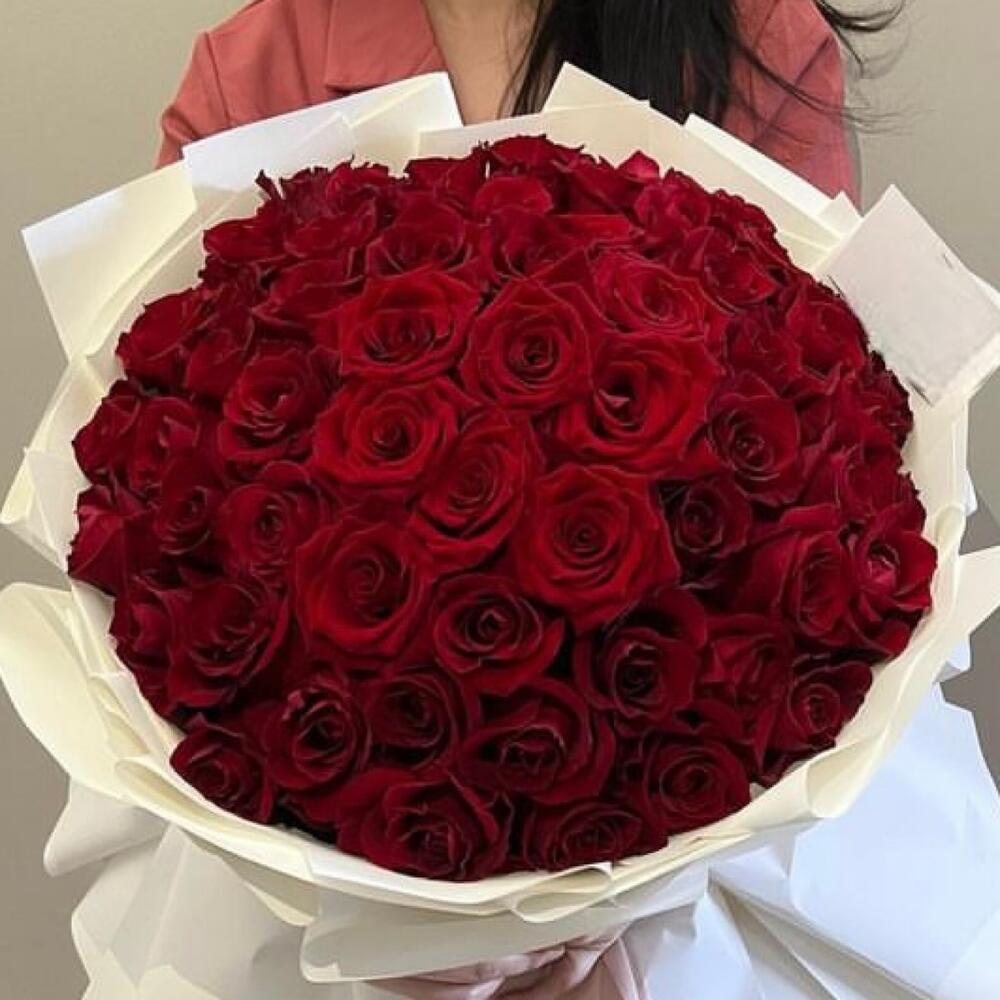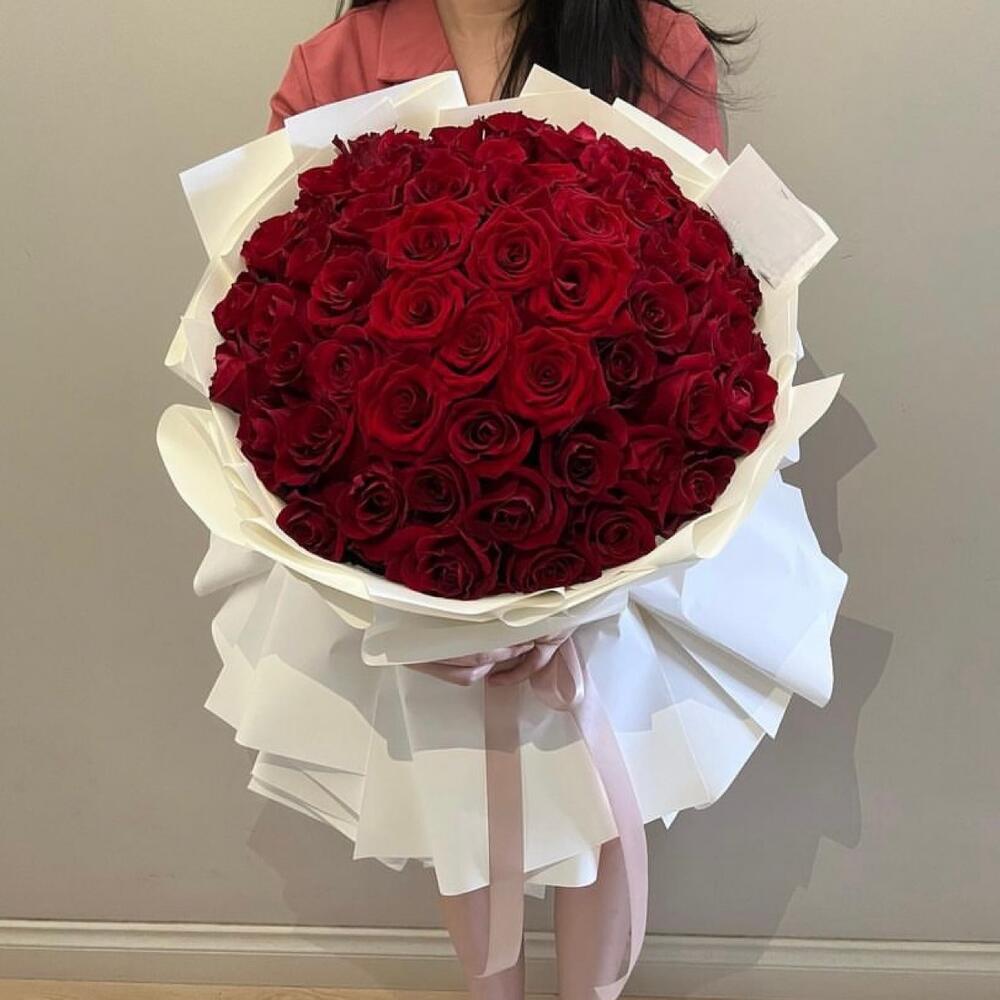 Red rose - 51 шт. Satin ribbon - 2 шт. Box - 1 шт. wrapping paper - 1 шт. card - 1 шт. good feelings - 100 шт. krizal - 1 шт. instruction - 1 шт.