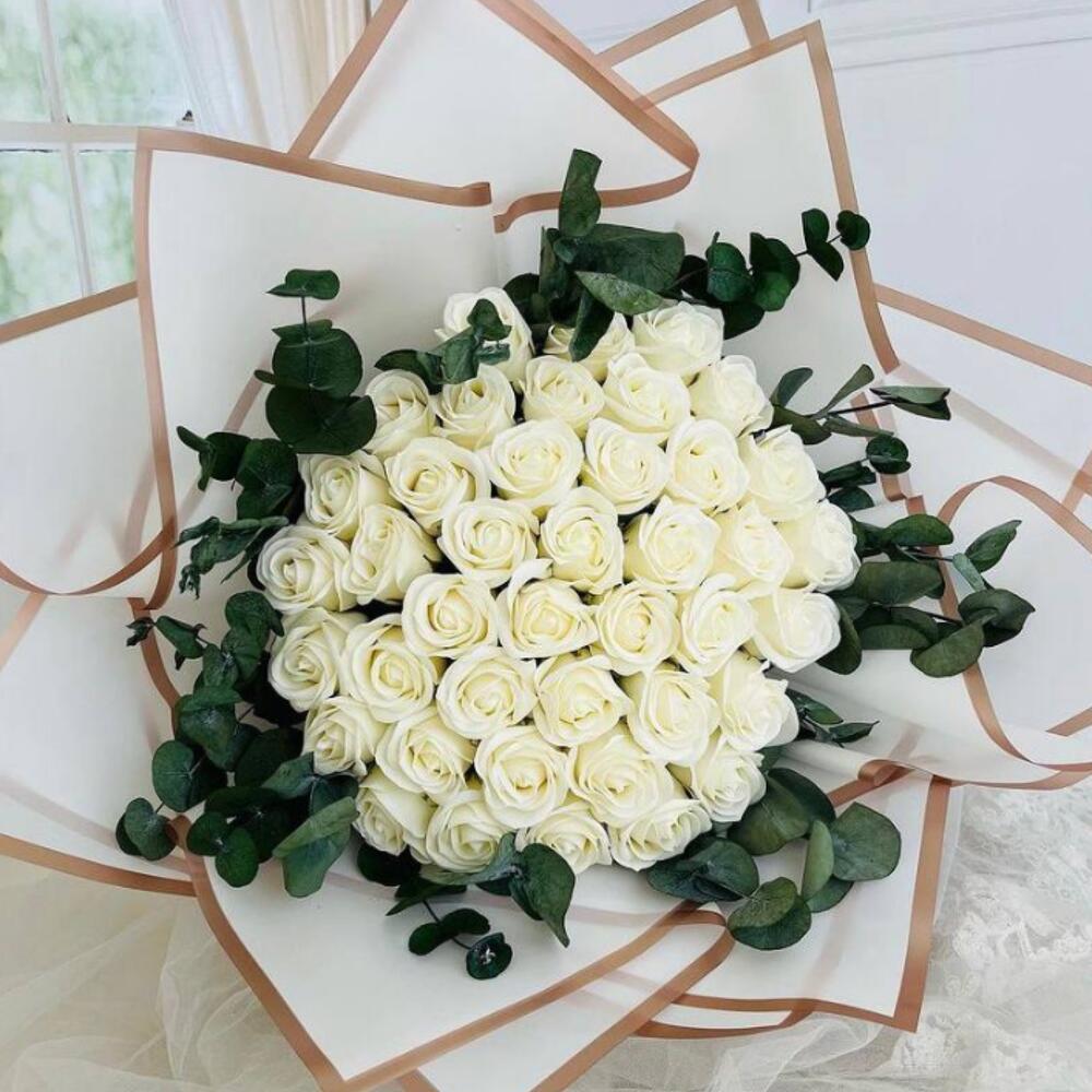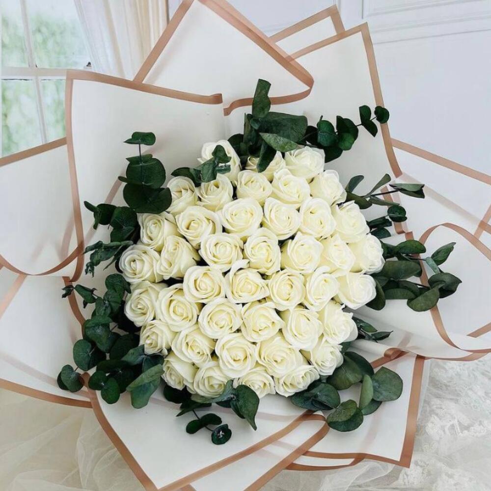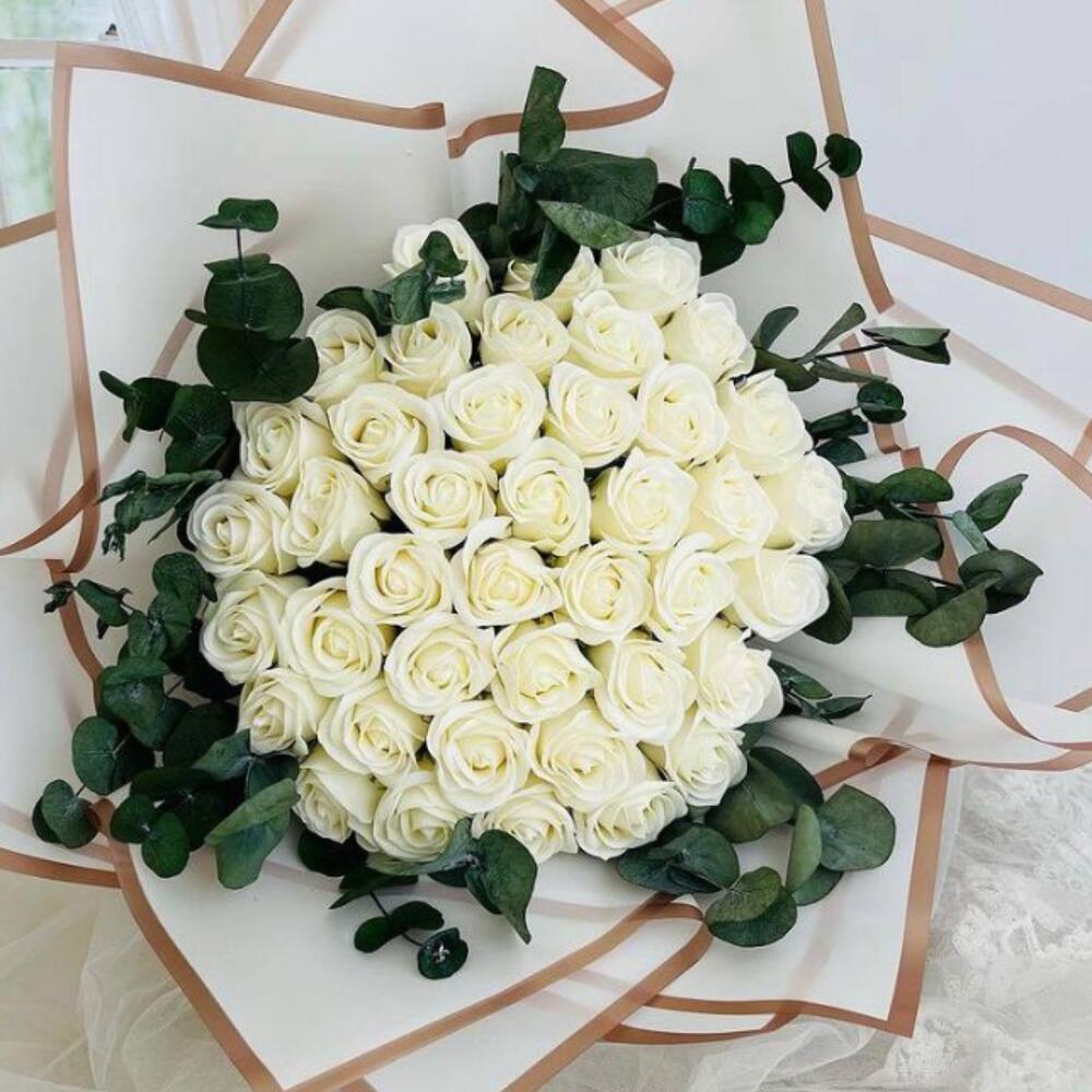 Bouquet of 51 white roses and eucalyptus