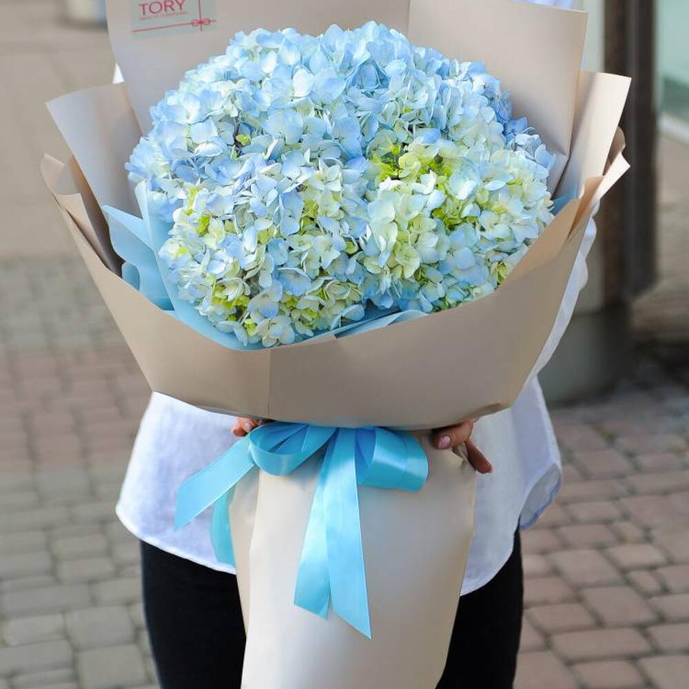 Composition: Hydrangea - 7, Wrapped - 1, Ribbon - 1 Sizes: WIDTH - 35CM; HEIGHT - 45CM; LENGTH - 45CM; (including packaging) Размер: 35 x 45 x 45 см