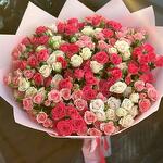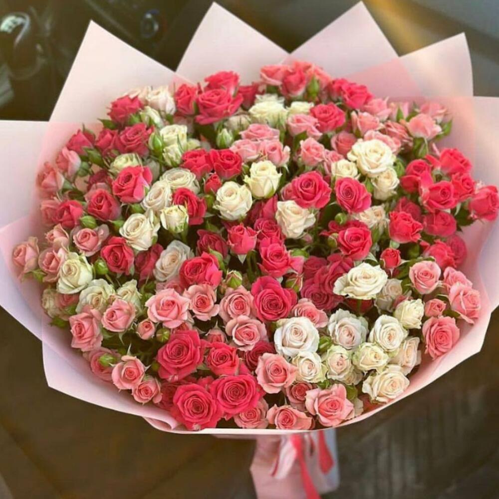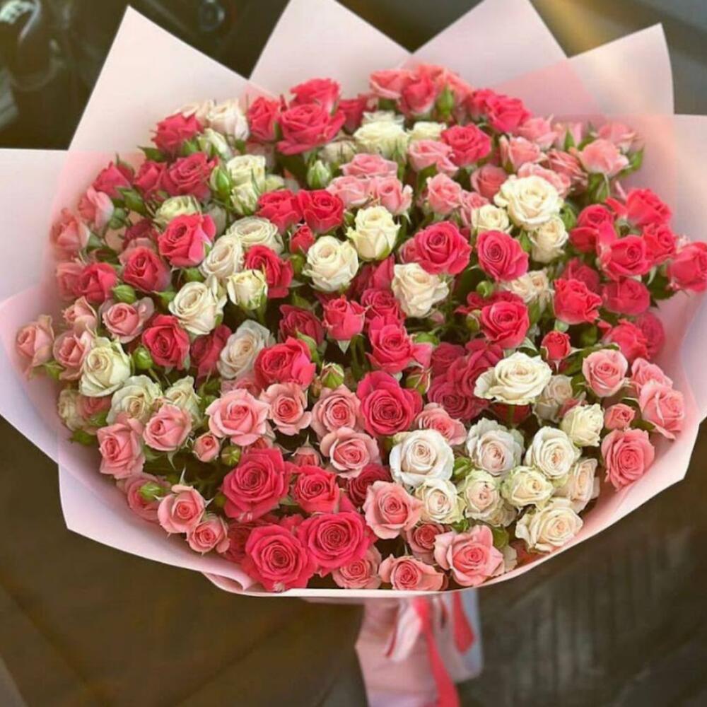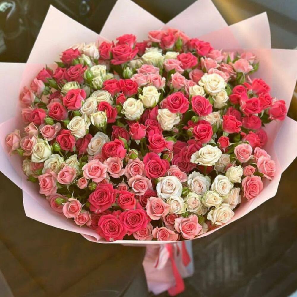 Satin ribbon - 2 шт. white bush rose - 50 шт. card - 1 шт. good mood - 100 шт. carrying box - 1 шт. red bush rose - 2 шт. pink bush rose - 50 шт. crisal - 1 шт. designed package - 2 шт.