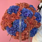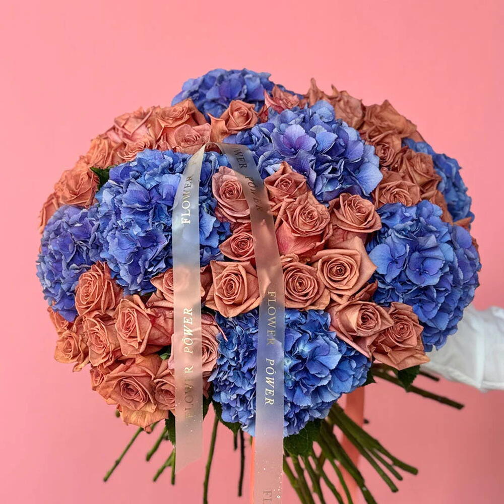Эффектный и уникальный букет с завораживающим контрастом ярко-синих гортензий и тёплых терракотовых роз. Эта элегантная композиция воплощает баланс, спокойствие и современное деревенское очарование — впечатляющий акцент, идеально подходящий для торжественных праздников, элегантных мероприятий или продуманного, художественного подарка.