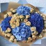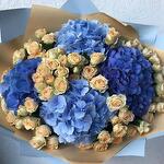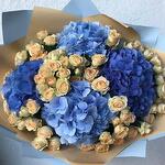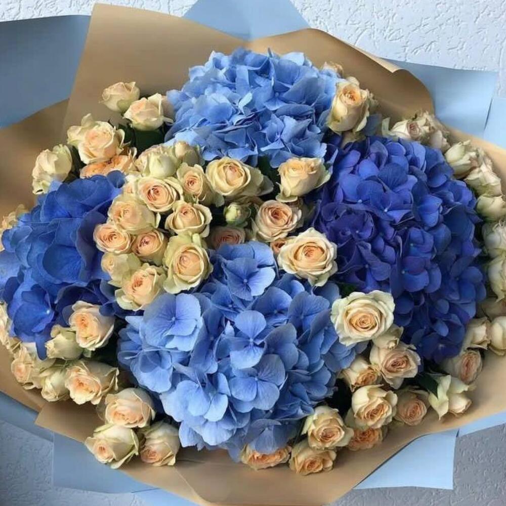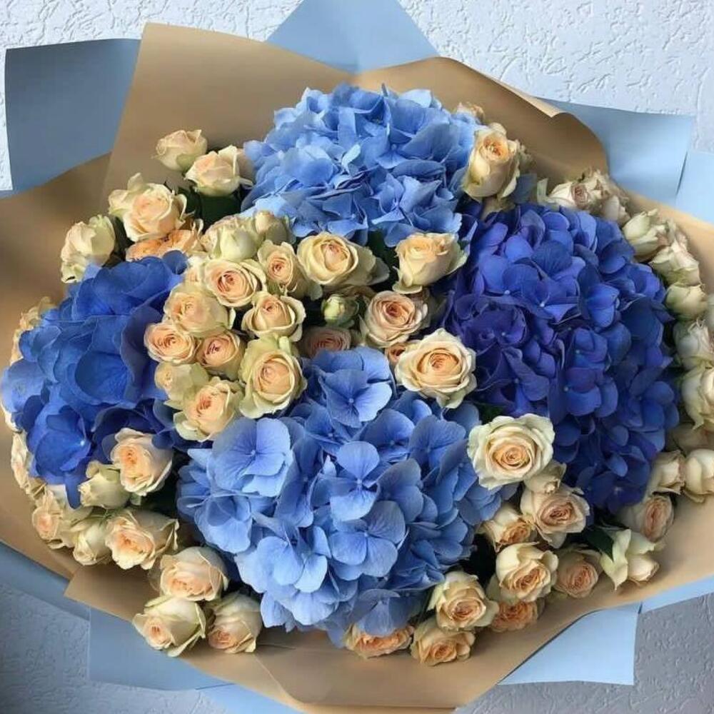 Bouquet of blue, light blue hydrangeas and beige bushy rose