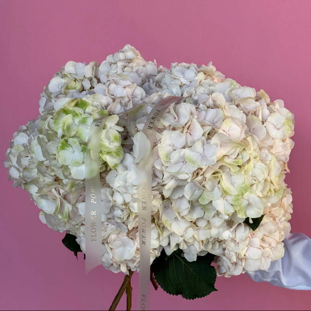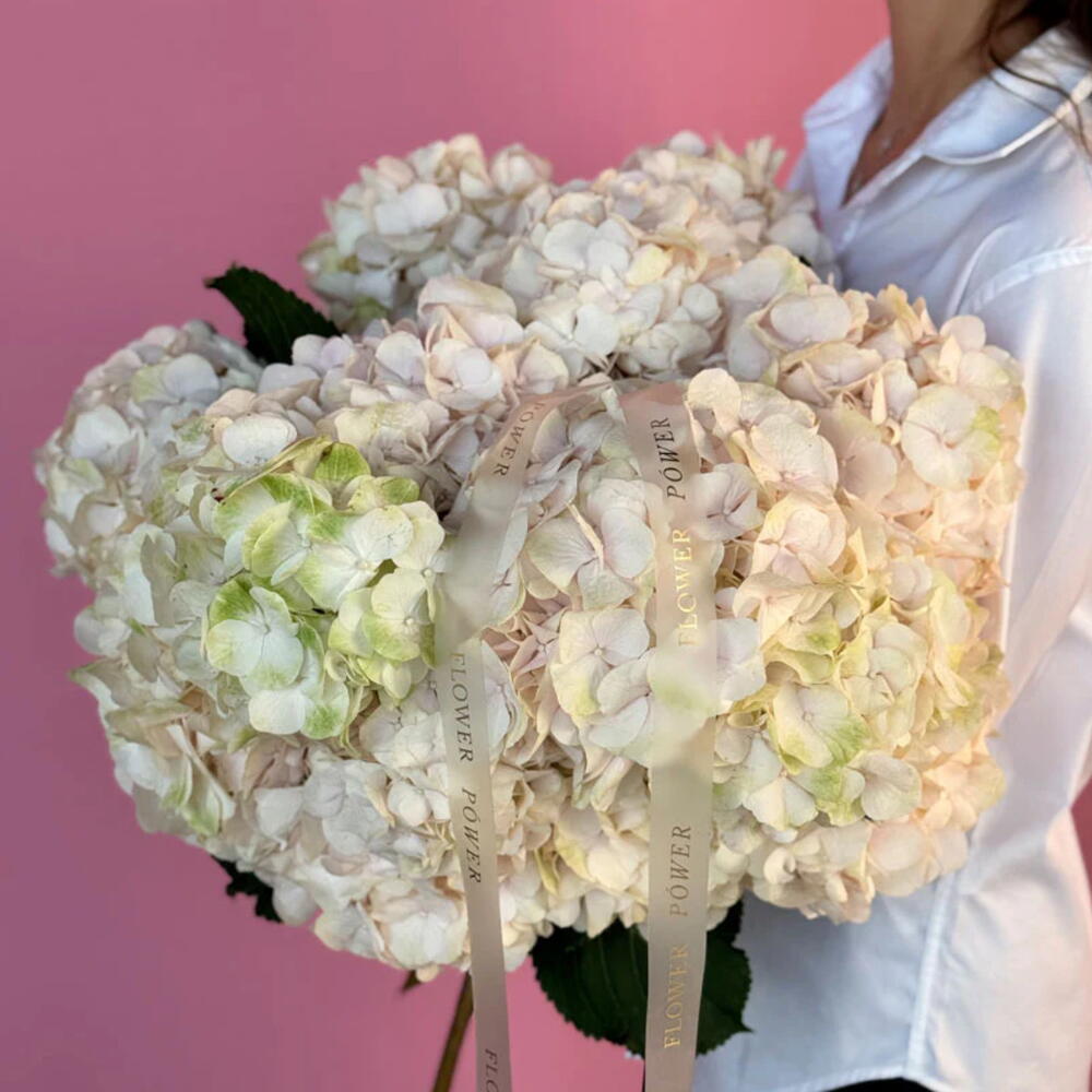 Великолепный и умиротворяющий букет кремово-белых гортензий, образующих пышные, словно облака, соцветия. Эта композиция — прекрасный символ чистоты, гармонии и элегантности — изысканный подарок на годовщину или изящный жест признательности, идеально подходящий для изысканных торжеств или значимых моментов.