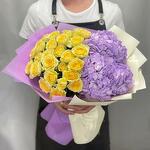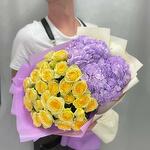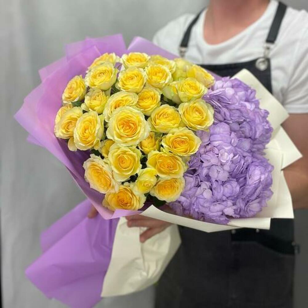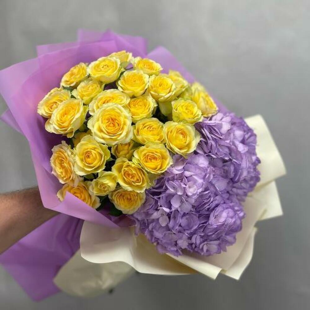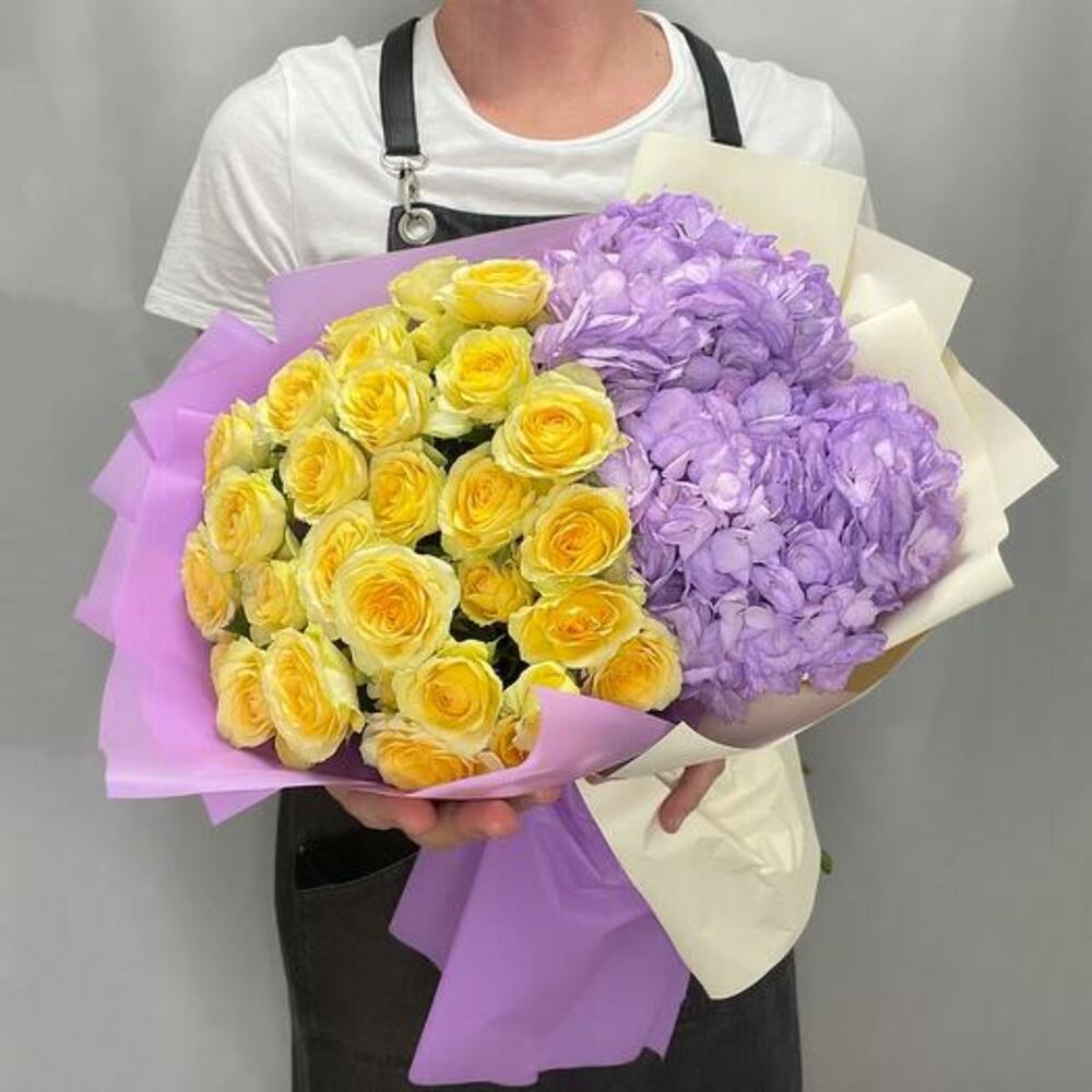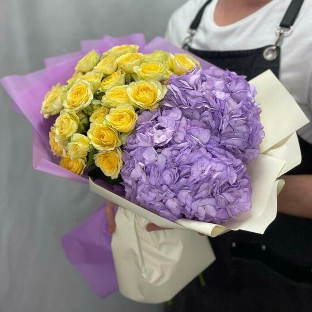 Мини-букет с гортензиями и кустовыми розами в стильной упаковке.