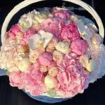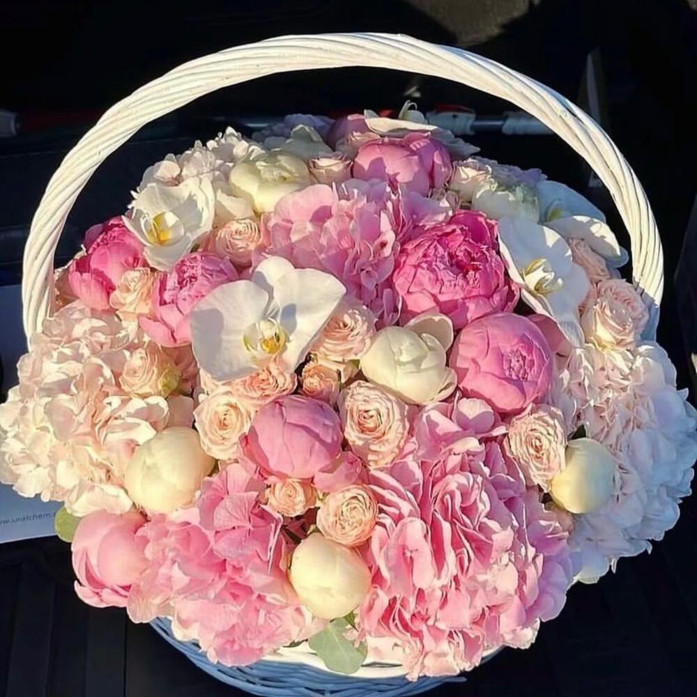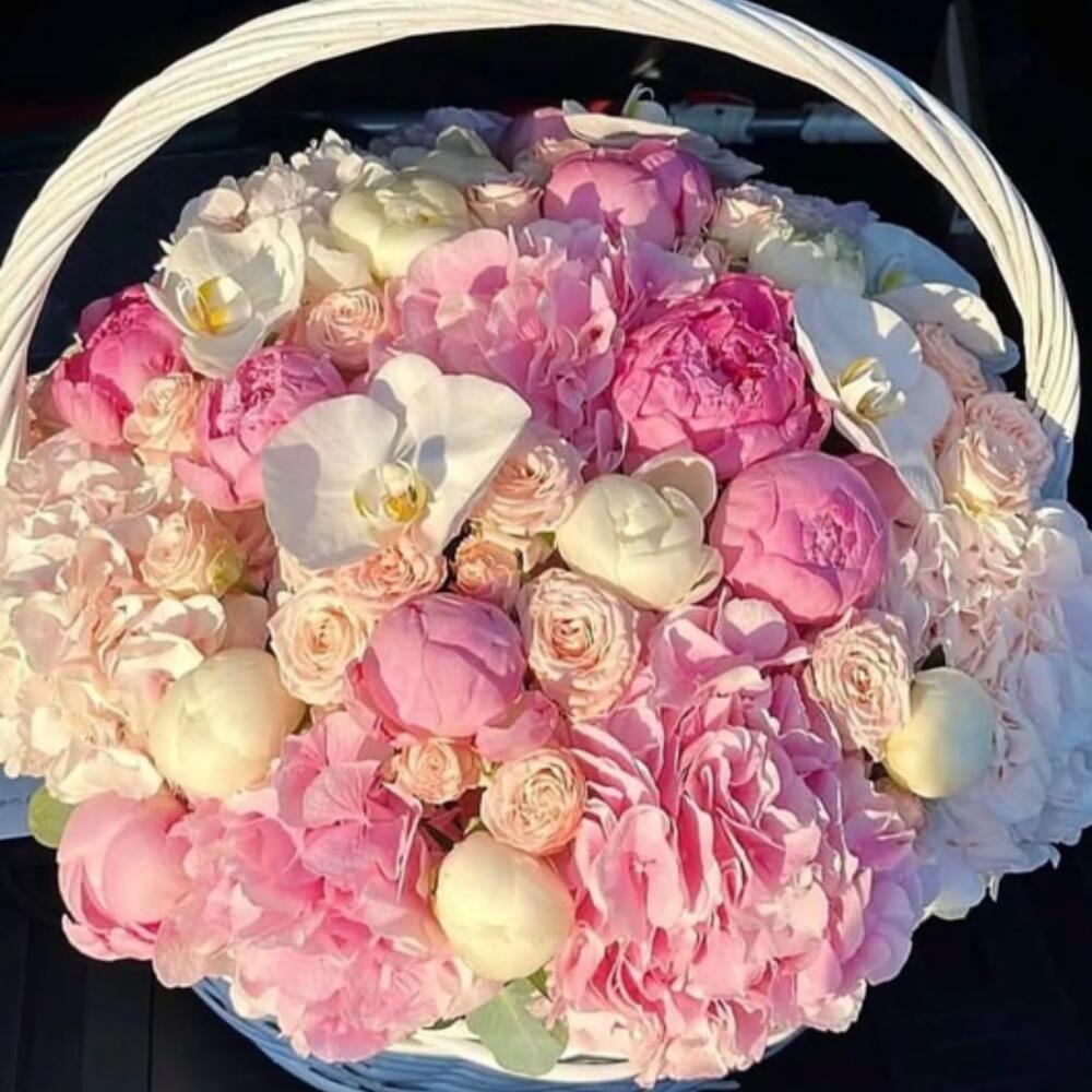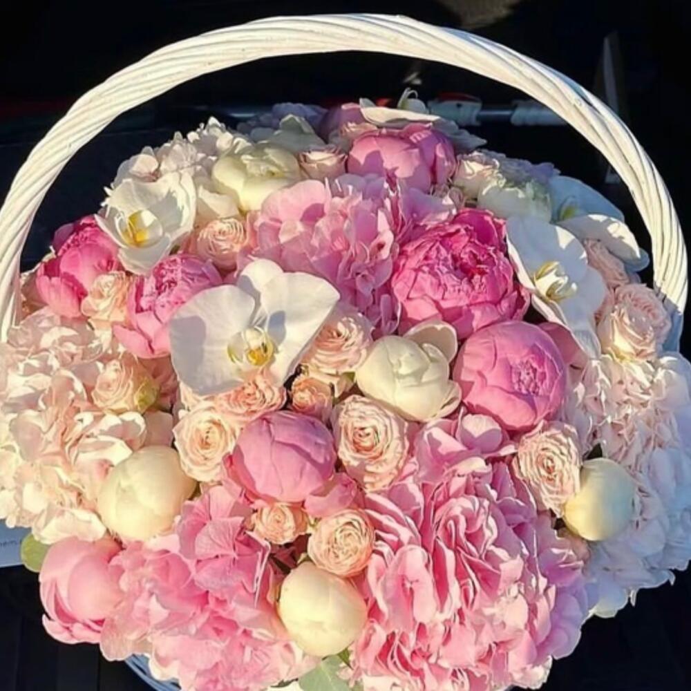 Bouquet of hydrangeas, peonies and orchids in a basket