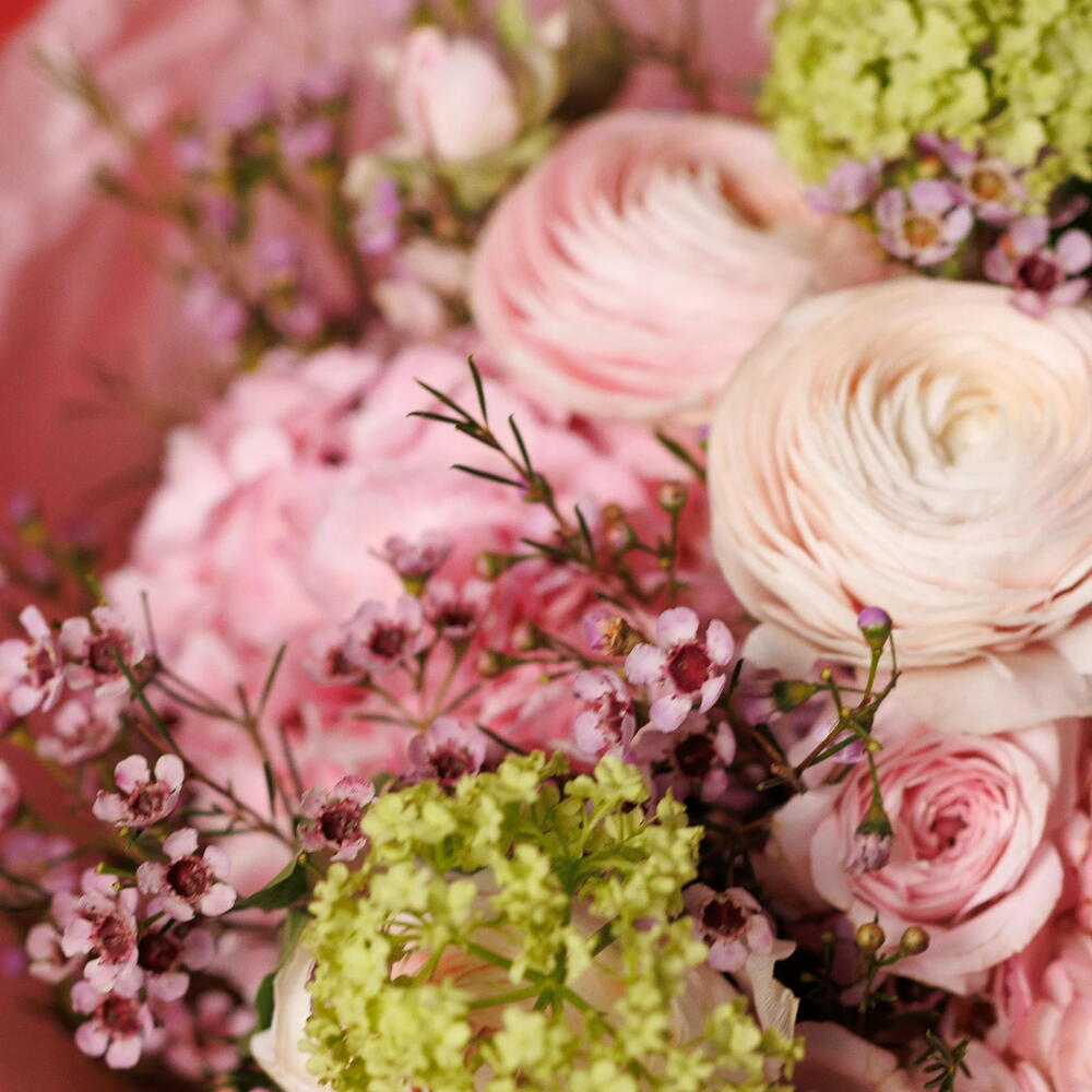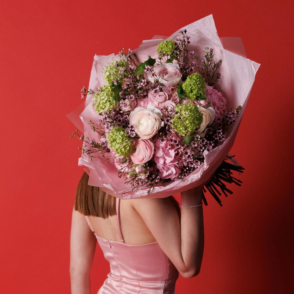 По-настоящему деликатная и эфирная композиция из калины, гортензии, ранункулюса, хамелауциума и спрей-роз. Этот красивый букет Flower Paradise сочетает мягкие фиолетовые, розовые и светло-зелёные тона, элегантно завернутый в крафтовую бумагу — идеальный, восхитительный подарок для любого праздника или чтобы очаровать любимого человека.