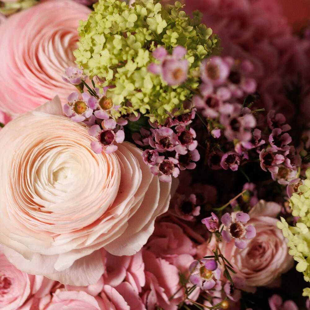 Рай: Большой букет из гортензий, ранункулюсов, кустовых роз и хамелауциума