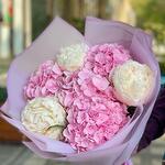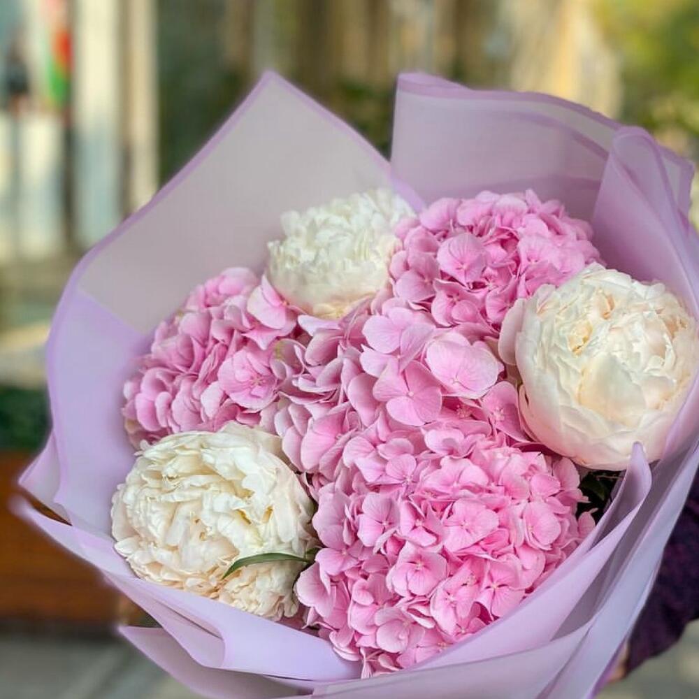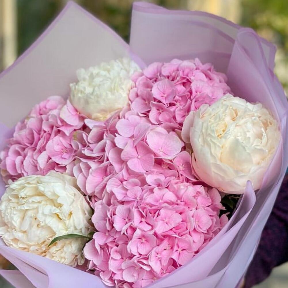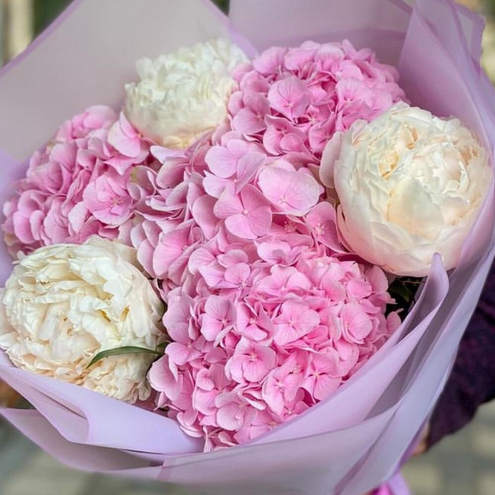 Satin ribbon - 2 шт. white peonies - 3 шт. wrapping paper - 1 шт. pink hydrangea - 4 шт. card - 1 шт. good feelings - 100 шт. krizal - 1 шт. instruction - 1 шт. aqua box - 1 шт.