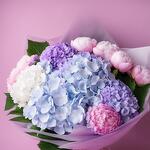 Satin ribbon - 2 шт. pink peonies - 5 шт. wrapping paper - 1 шт. card - 1 шт. good feelings - 100 шт. krizal - 1 шт. instruction - 1 шт. mixed hydrangeas - 6 шт. aqua box - 1 шт.