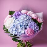 Bouquet of pink peonies and mixed hydrangeas