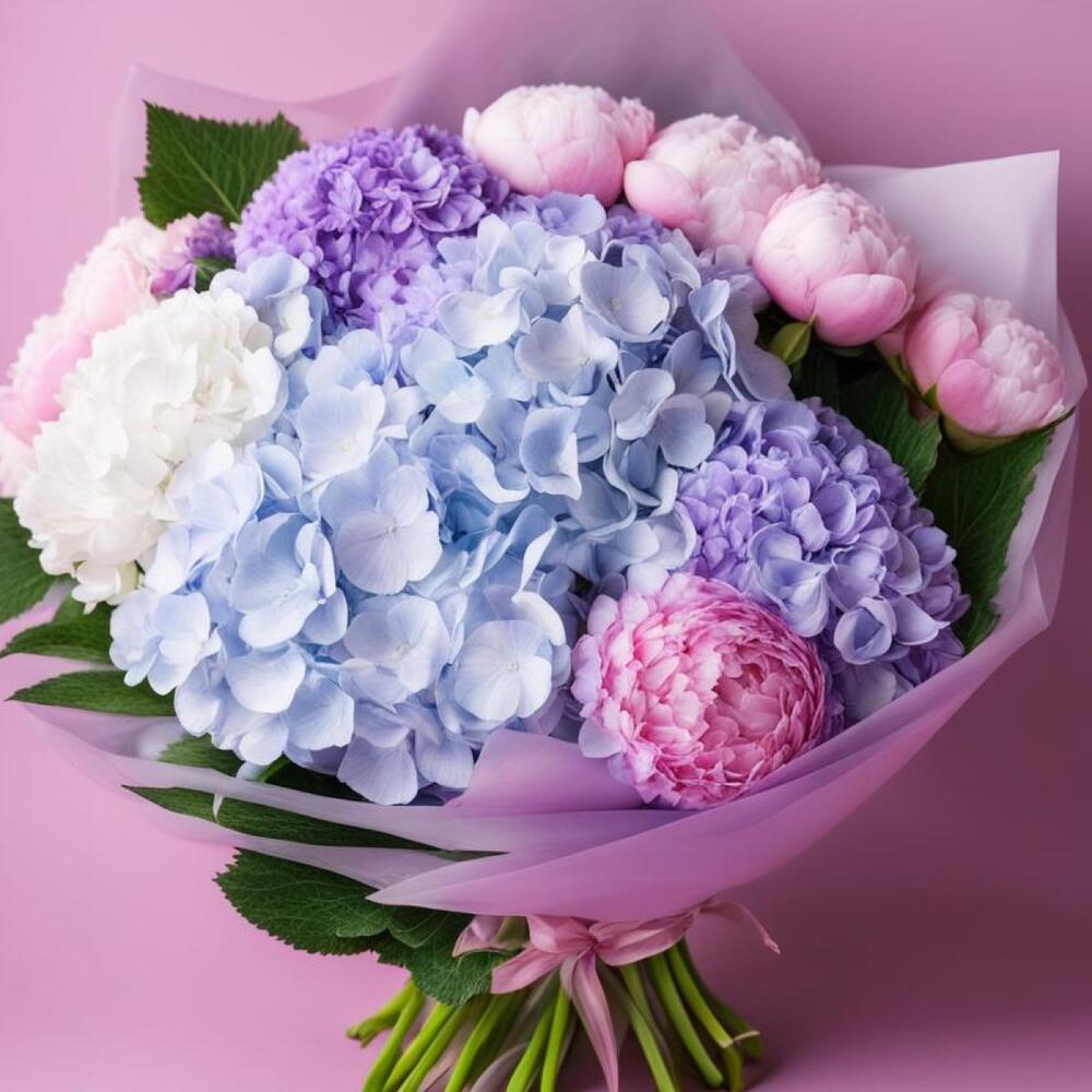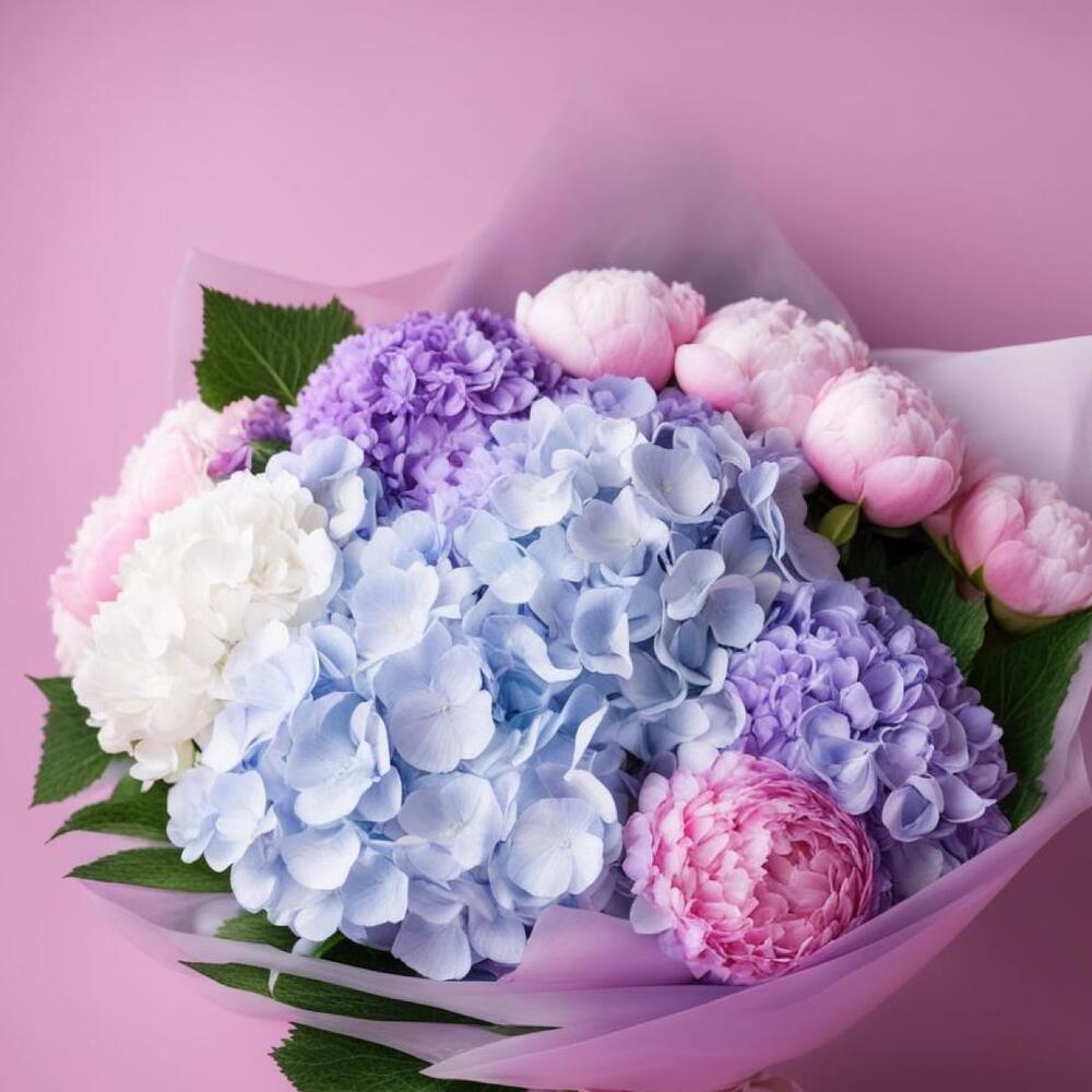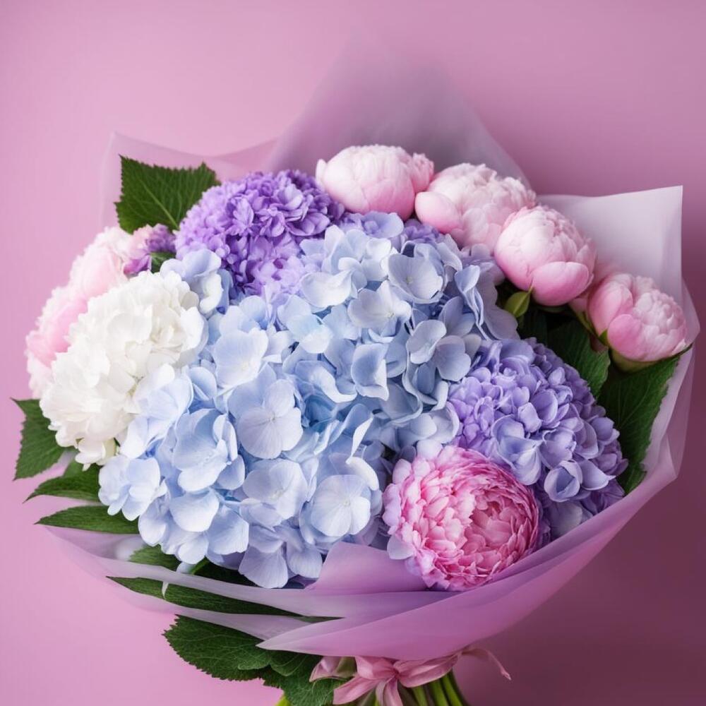 Bouquet of pink peonies and mixed hydrangeas
