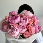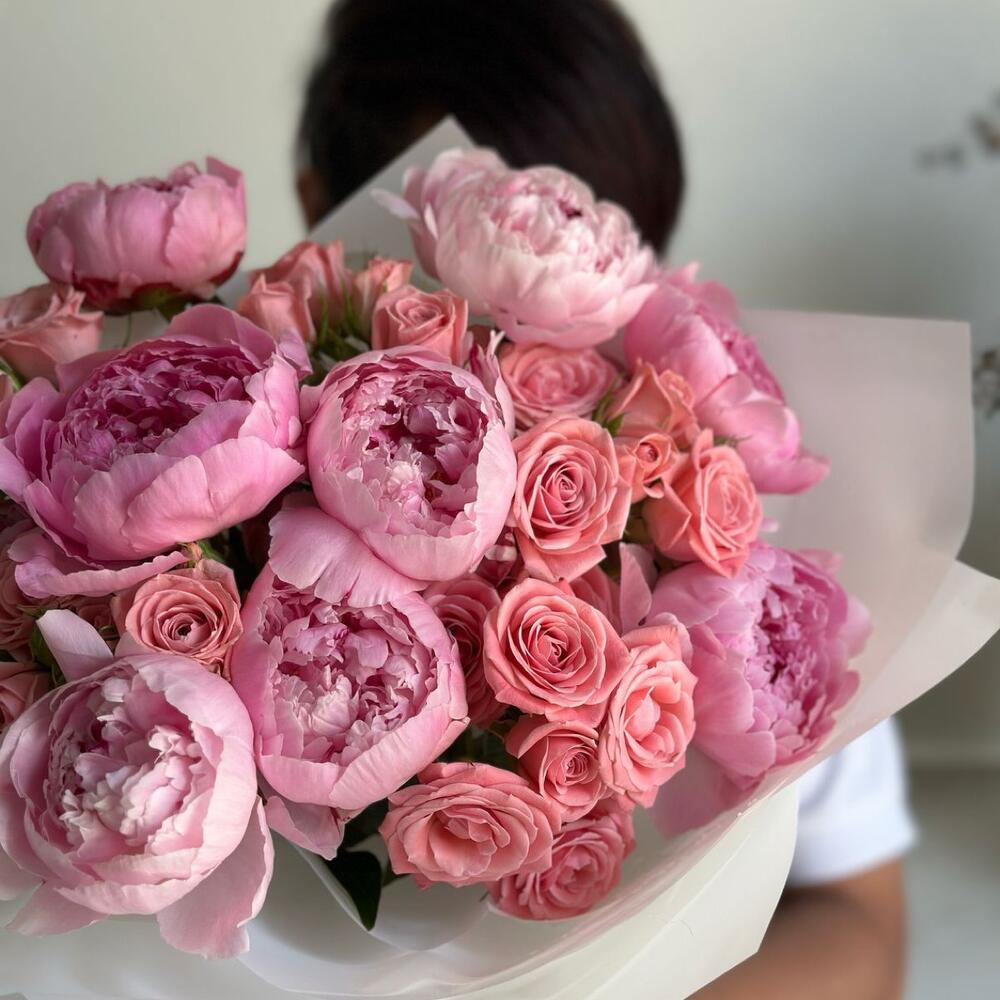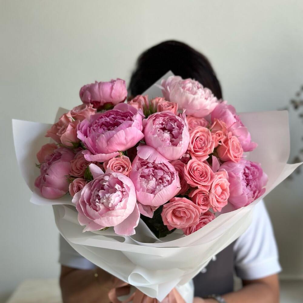 Bouquet of pink peonies and spay roses