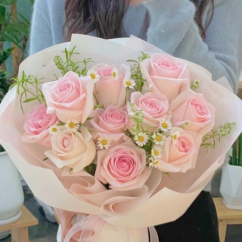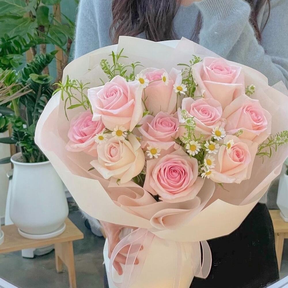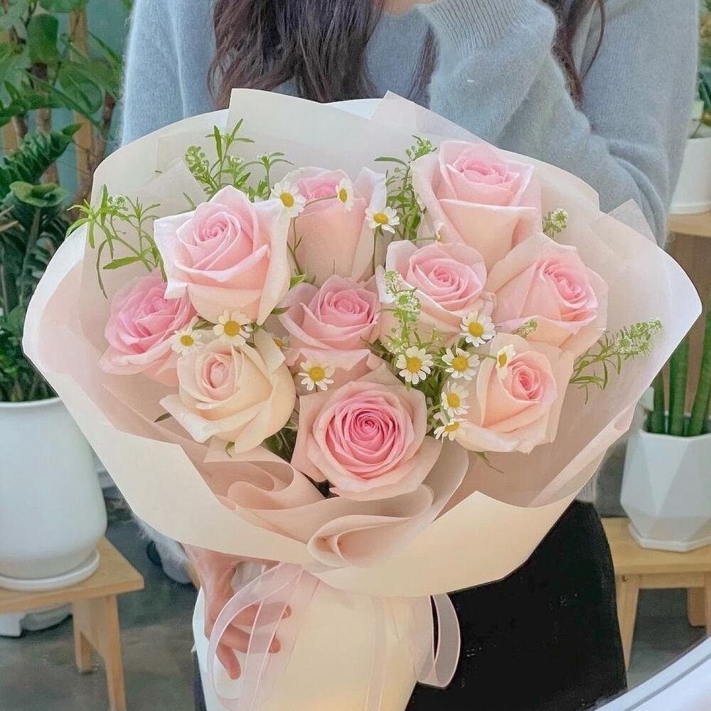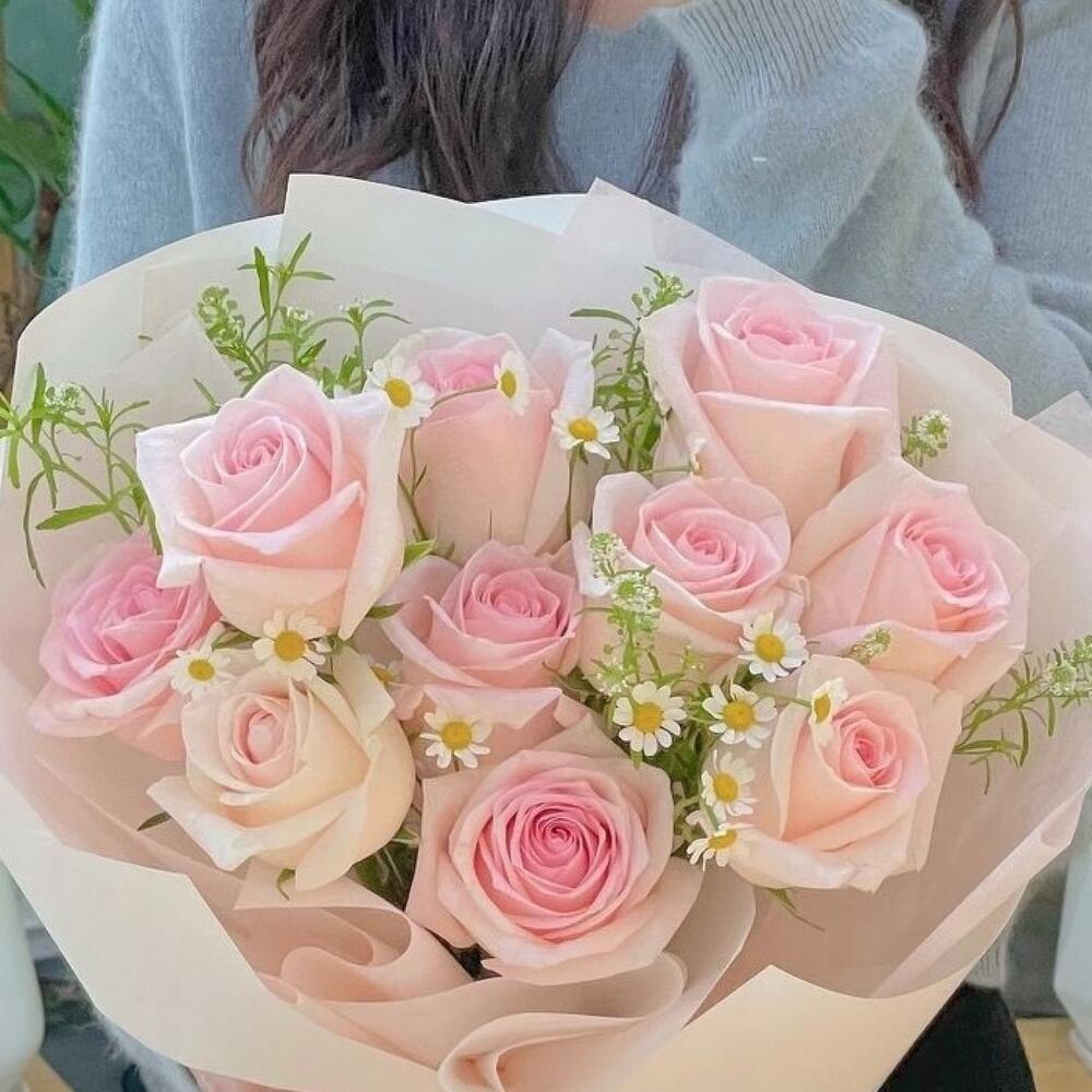 Satin ribbon - 2 шт. Pink rose - 10 шт. chamomile - 5 шт. wrapping paper - 1 шт. card - 1 шт. good feelings - 100 шт. krizal - 1 шт. instruction - 1 шт.