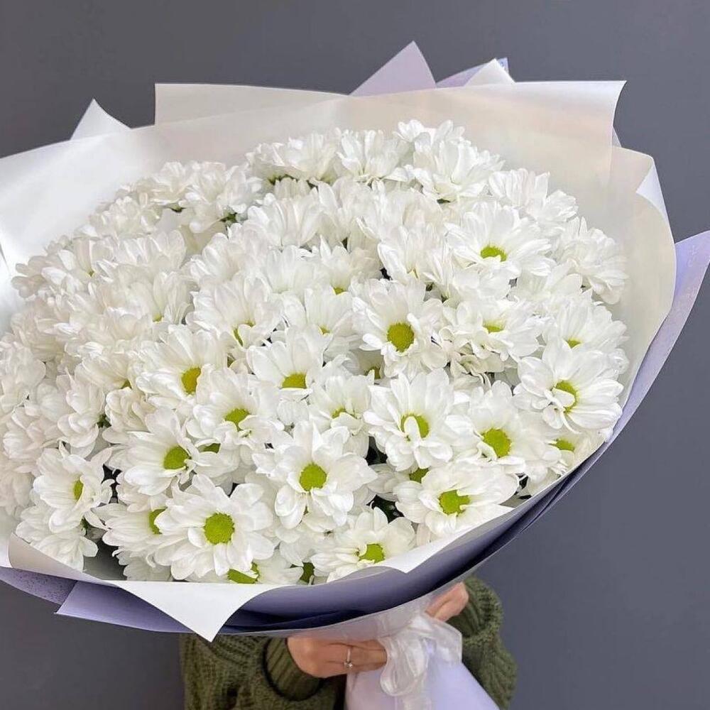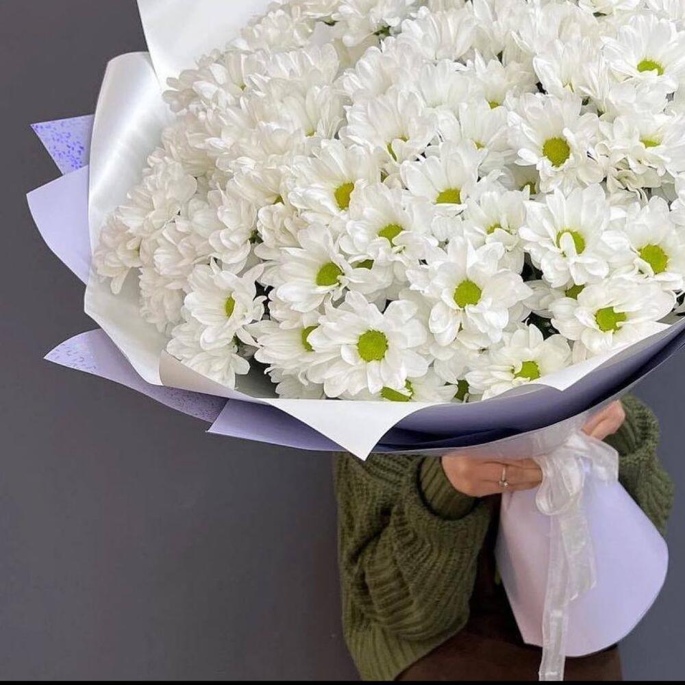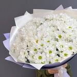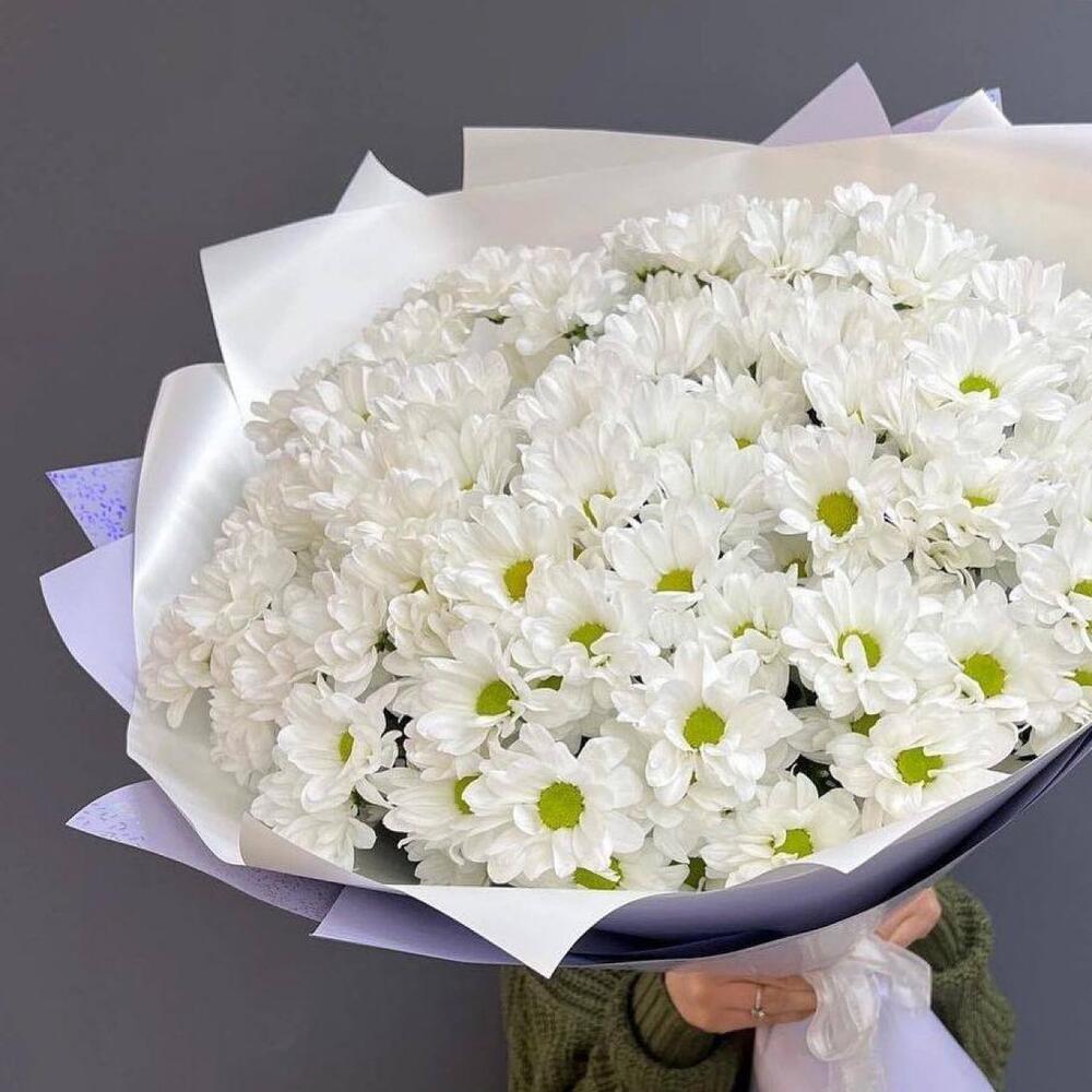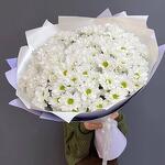 Satin ribbon - 2 шт. white chrysanthemums - 101 шт. chrysal - 1 шт. designer packaging - 2 шт. card - 1 шт. instruction - 1 шт. carrying box - 1 шт.
