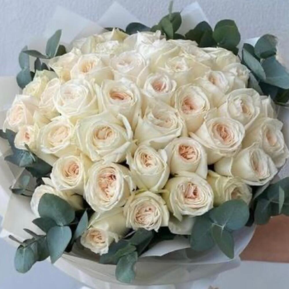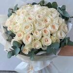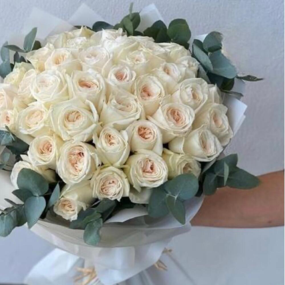 Satin ribbon - 2 шт. Eucalyptus - 10 шт. Box - 1 шт. wrapping paper - 1 шт. card - 1 шт. krizal - 1 шт. white peony rose - 51 шт.