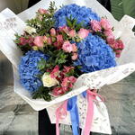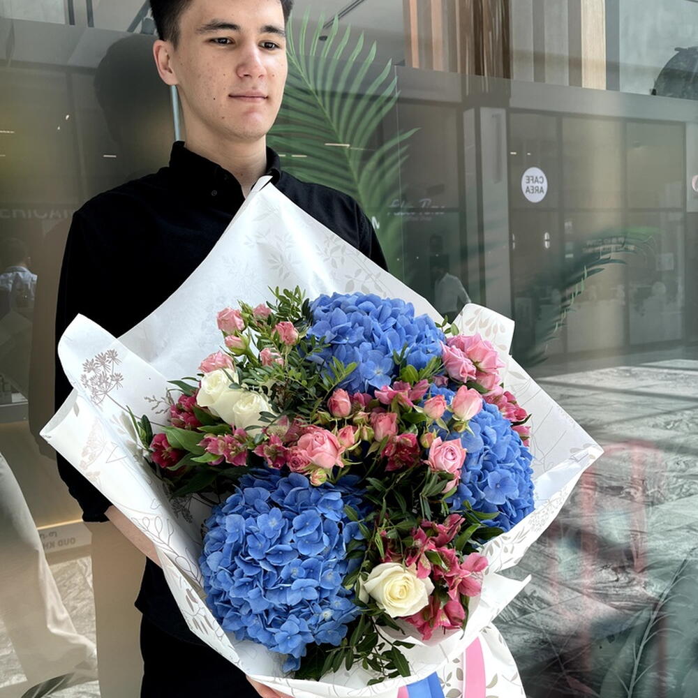Composition: Hydrangea - 3, Alstroemeria - 7, Pistacia - 6, Rose white - 4, Spray Rose Odilia light pink - 7 Sizes: WIDTH - 45CM; HEIGHT - 60CM; LENGTH - 60CM; (including packaging) Размер: 45 x 60 x 60 см
