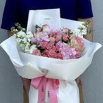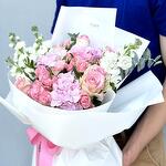 Composition: Jumilia rose - 8, Hydrangea - 3, Pistacia - 3, Mattiola - 4, Spray Rose Odilia light pink - 6, Eucalyptus - 1, Wrapping Paper - 1, ribbon - 1 Sizes: WIDTH - 40CM; HEIGHT - 50CM; LENGTH - 50CM; (including packaging) Размер: 40 x 50 x 50 см