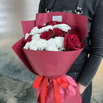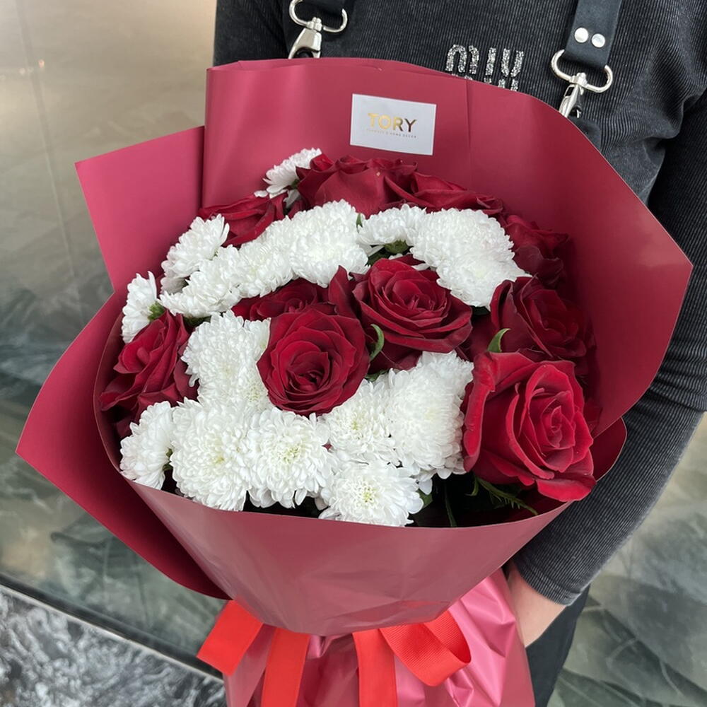 Composition: Rose red - 10, Chrysanthemum Santini - 7 Sizes: WIDTH - 35CM; HEIGHT - 55CM; LENGTH - 55CM; (including packaging) Размер: 35 x 55 x 55 см
