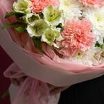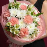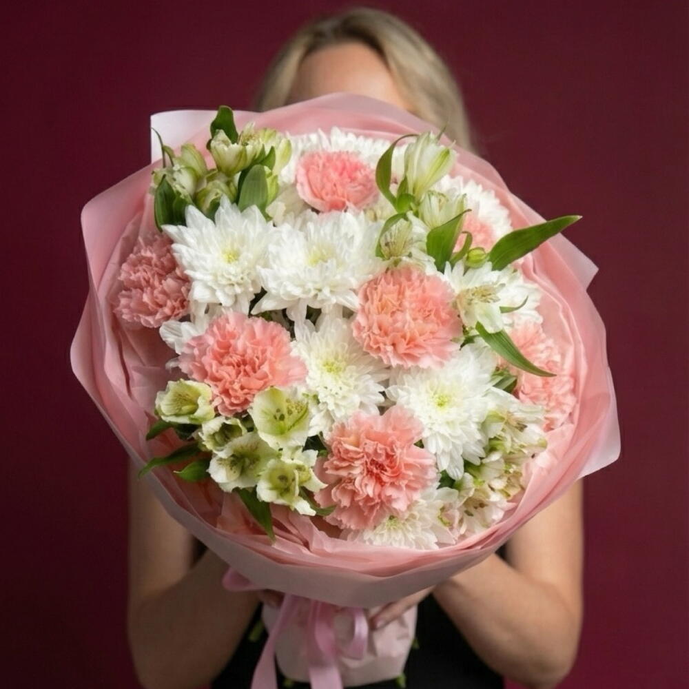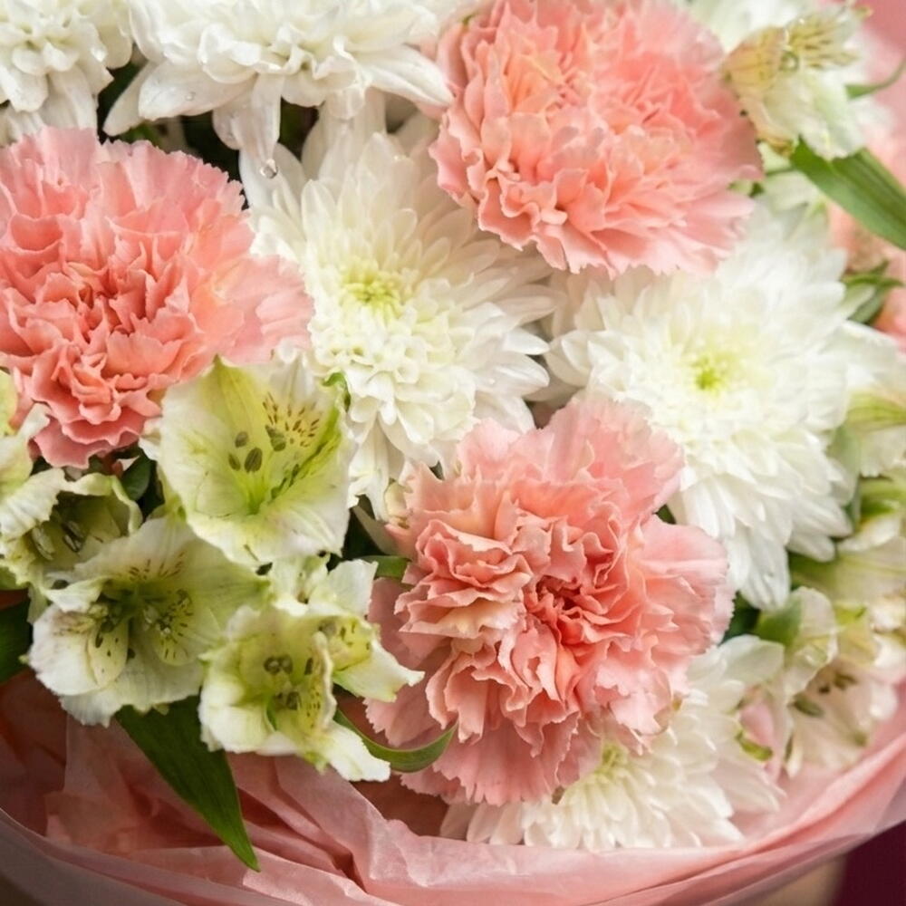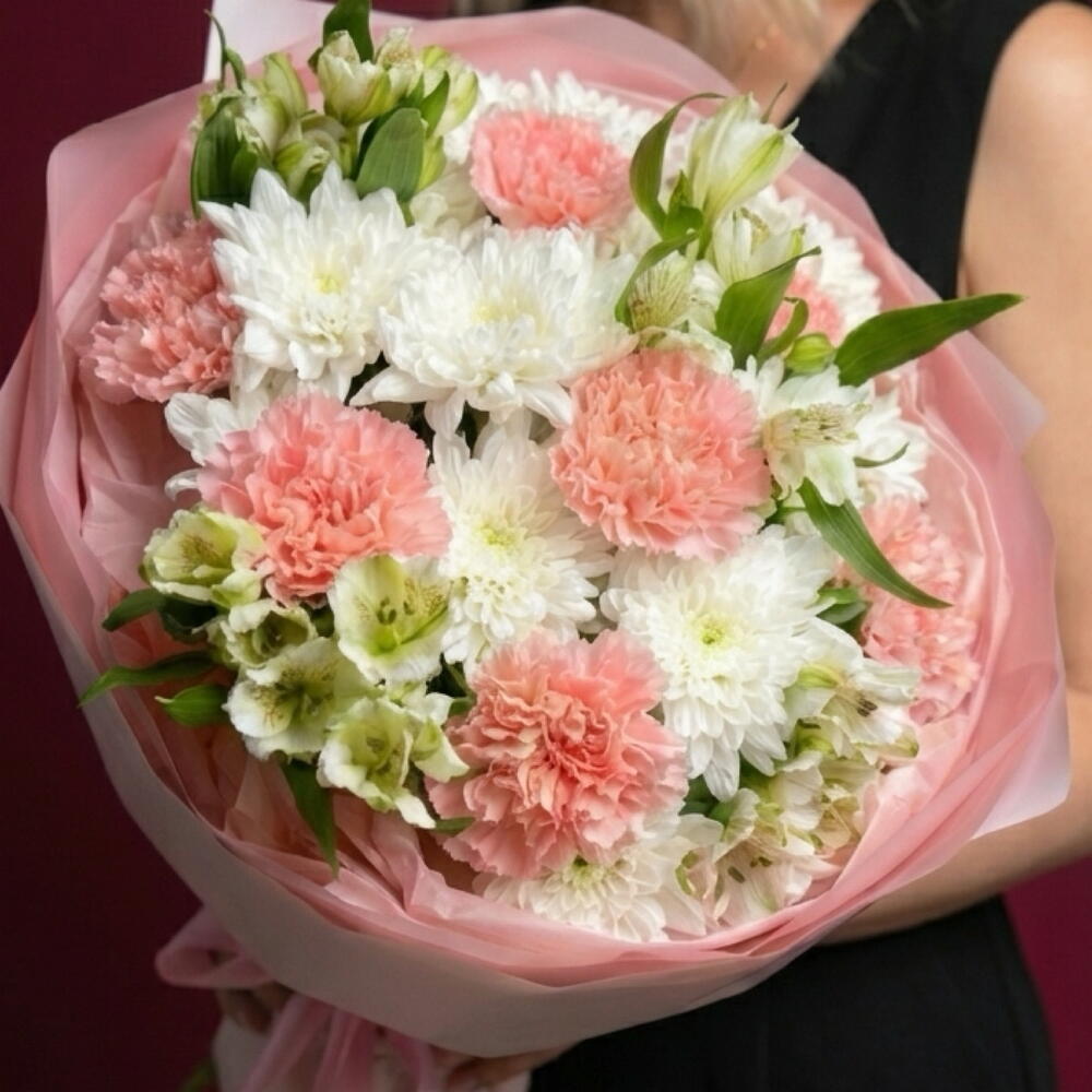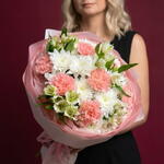 This designer bouquet is the perfect gift for any special occasion. It consists of three elegant chrysanthemums, which soften the contrast with five bright and saturated carnations. The composition also includes five delicious alstroemeria, adding tenderness and sophistication to the bouquet. This bouquet is distinguished by its unique style and attention to detail.
