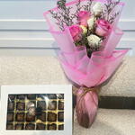 Immerse yourself in the blissful embrace of hand-selected florals bundled in a beautiful arrangement of thirteen carefully chosen Pink Roses, delicately contrasted with four enchanting Licianthus in pure white. To make this arrangement even more special, it includes the splash of a color explosion from ten stems of regal purple Limonium. The undeniable highlight of this bouquet is the exquisite addition of 25 pieces of delicious, rich quality chocolates. Perfect to convey your deepest emotions on any heartwarming occasion, this captivating mix is more than a gift—its an experience!