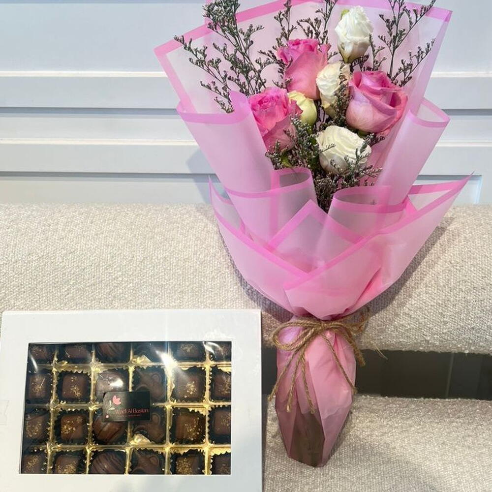 Immerse yourself in the blissful embrace of hand-selected florals bundled in a beautiful arrangement of thirteen carefully chosen Pink Roses, delicately contrasted with four enchanting Licianthus in pure white. To make this arrangement even more special, it includes the splash of a color explosion from ten stems of regal purple Limonium. The undeniable highlight of this bouquet is the exquisite addition of 25 pieces of delicious, rich quality chocolates. Perfect to convey your deepest emotions on any heartwarming occasion, this captivating mix is more than a gift—its an experience!