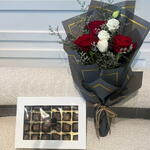 This exquisite arrangement from our Florists Specials collection flaunts the bold charm of thirteen stunning Red Roses, intertwined with the delicate elegance of four White Licianthus blossoms. The bouquet is further accentuated with the soft splash of ten Purple Limonium stems. An energizing blend of color, adorned with a decadent treat of twenty-five exquisite chocolates, making this an irresistible gift for any special occasion. Luxurious way to show your feelings through the mesmerizing sophistication of flowers and sweetness of chocolate delights.
