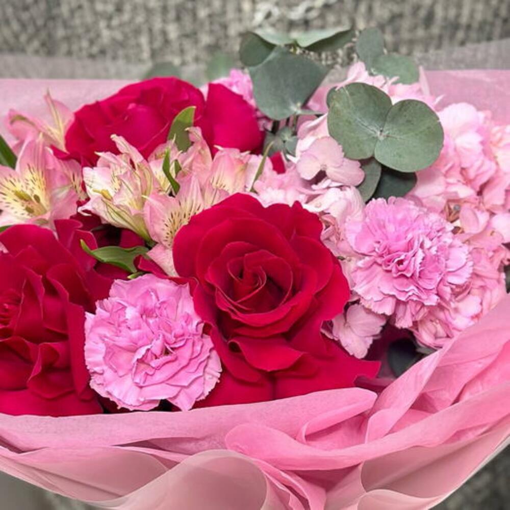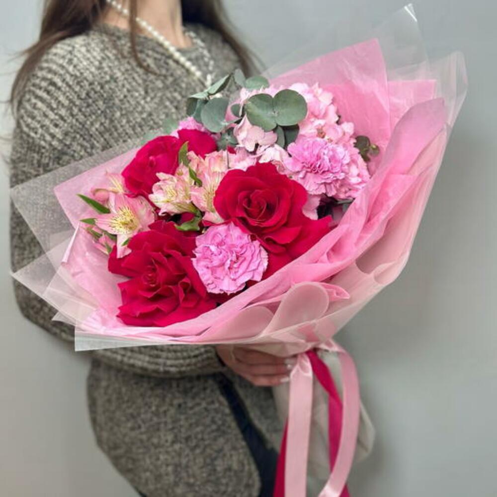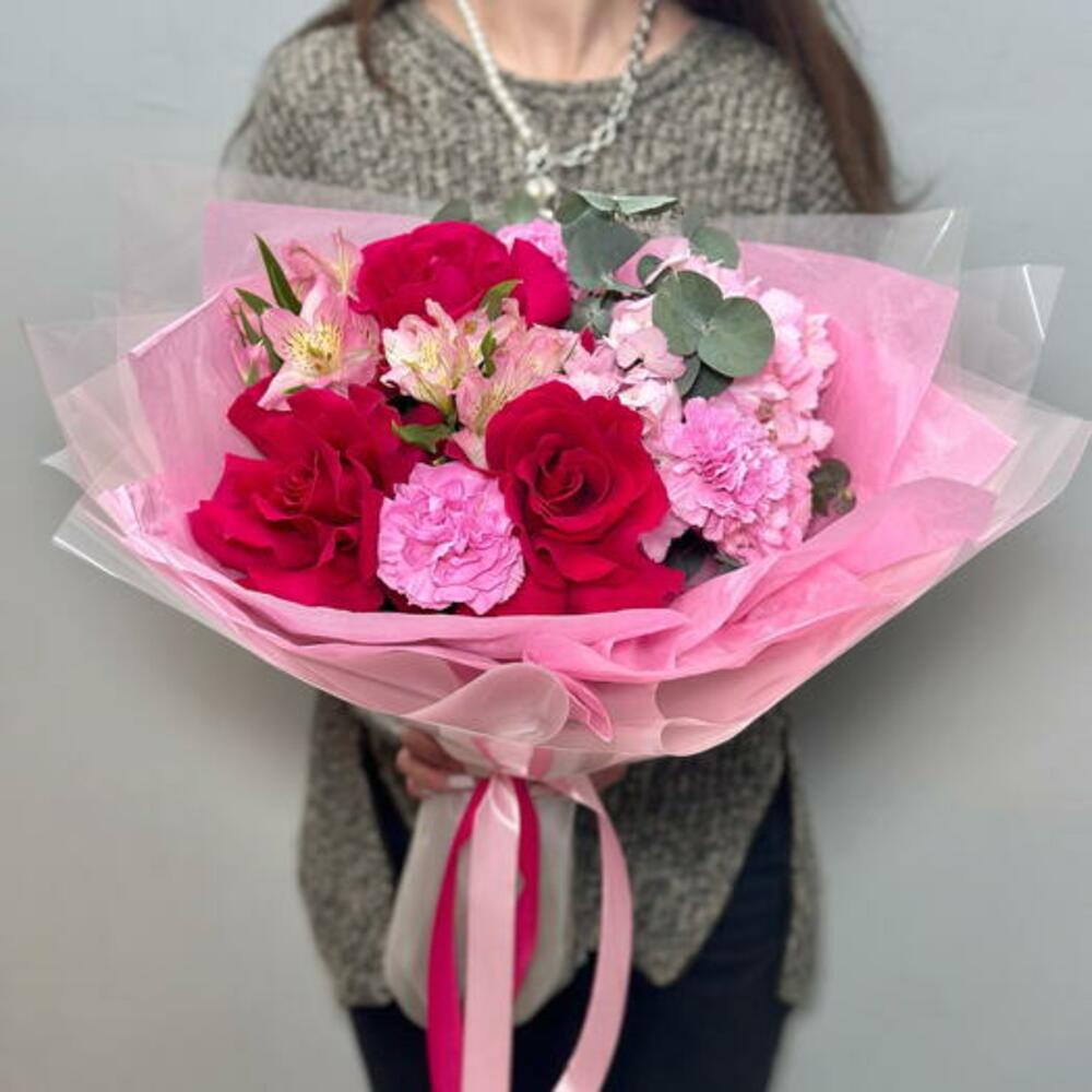 Eucalyptus - 1 шт. Hydrangea - 1 шт. Wrapping - 1 шт. carnation pink - 3 шт. pink alstroemeria - 2 шт. Роза София Лорен - 3 шт.