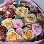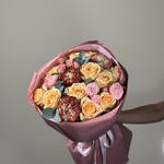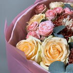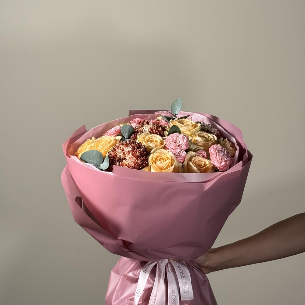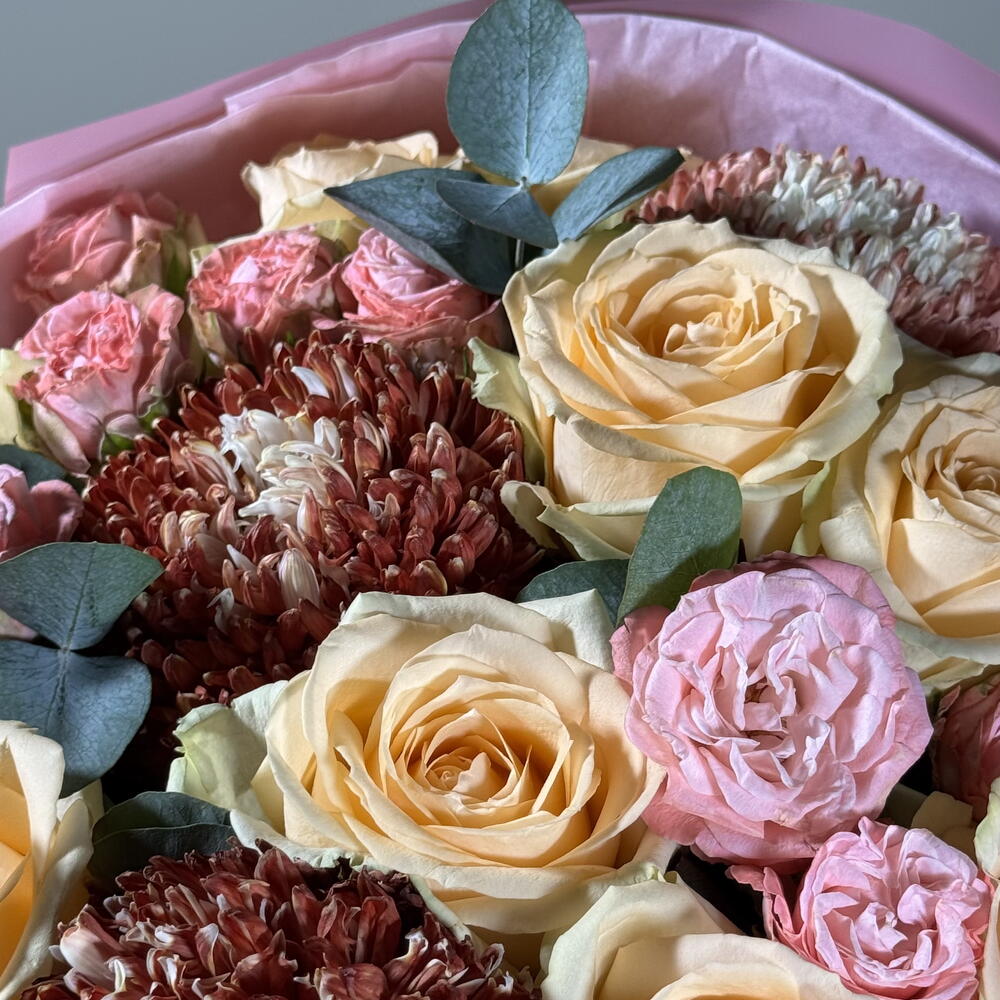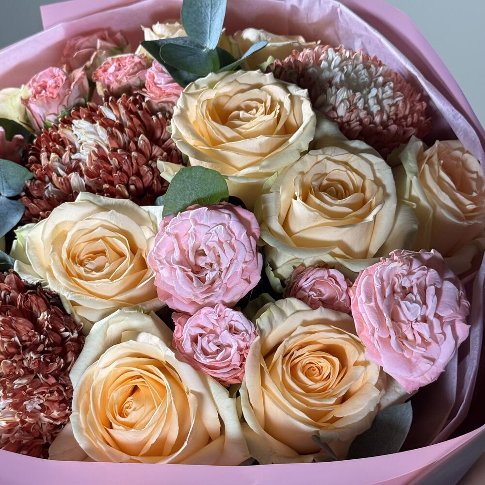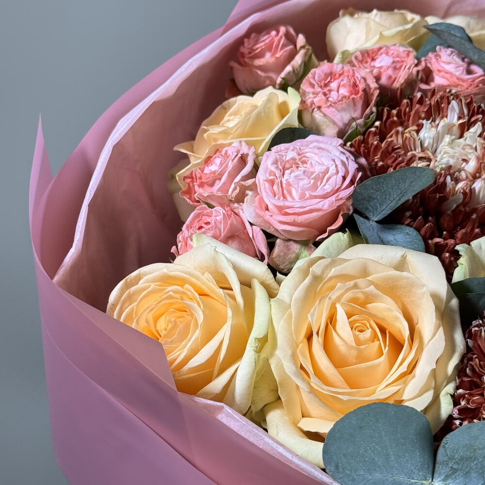 Eucalyptus - 3 шт. Chrysanthemum - 3 шт. премиальная упаковка - 6 шт. роза аваланш пич - 9 шт. брендированная лента с рисунком роз - 2 шт. розы спрей мадам бомбастик - 3 шт. брендированная карточка с сообщением и конверт - 1 шт. брендированная премиальная сумка для переноски цветов - 1 шт.