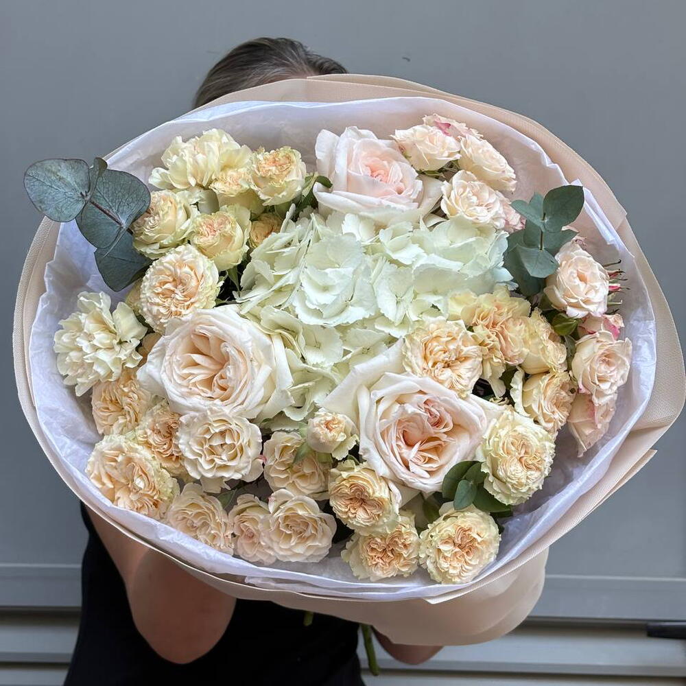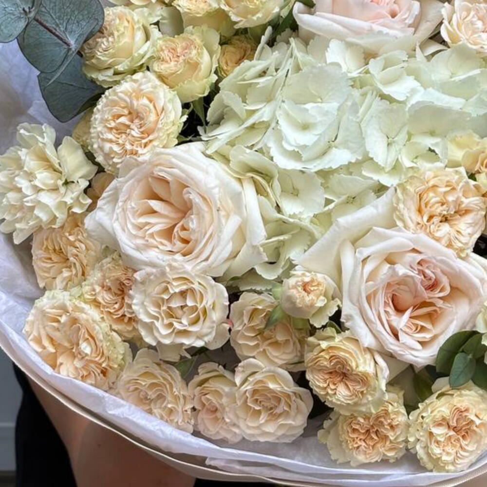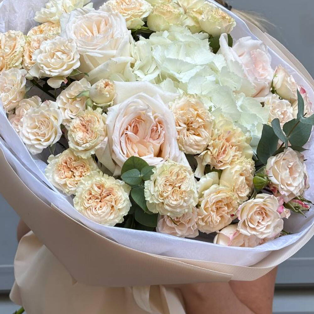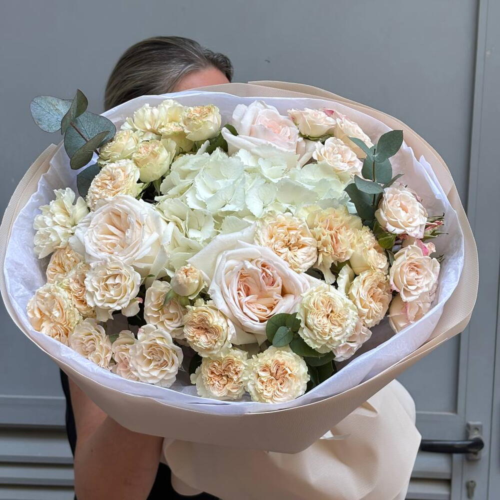 Eucalyptus - 3 шт. carnation - 3 шт. hydrangea white - 1 шт. summer rose - 5 шт. ohara white - 3 шт.