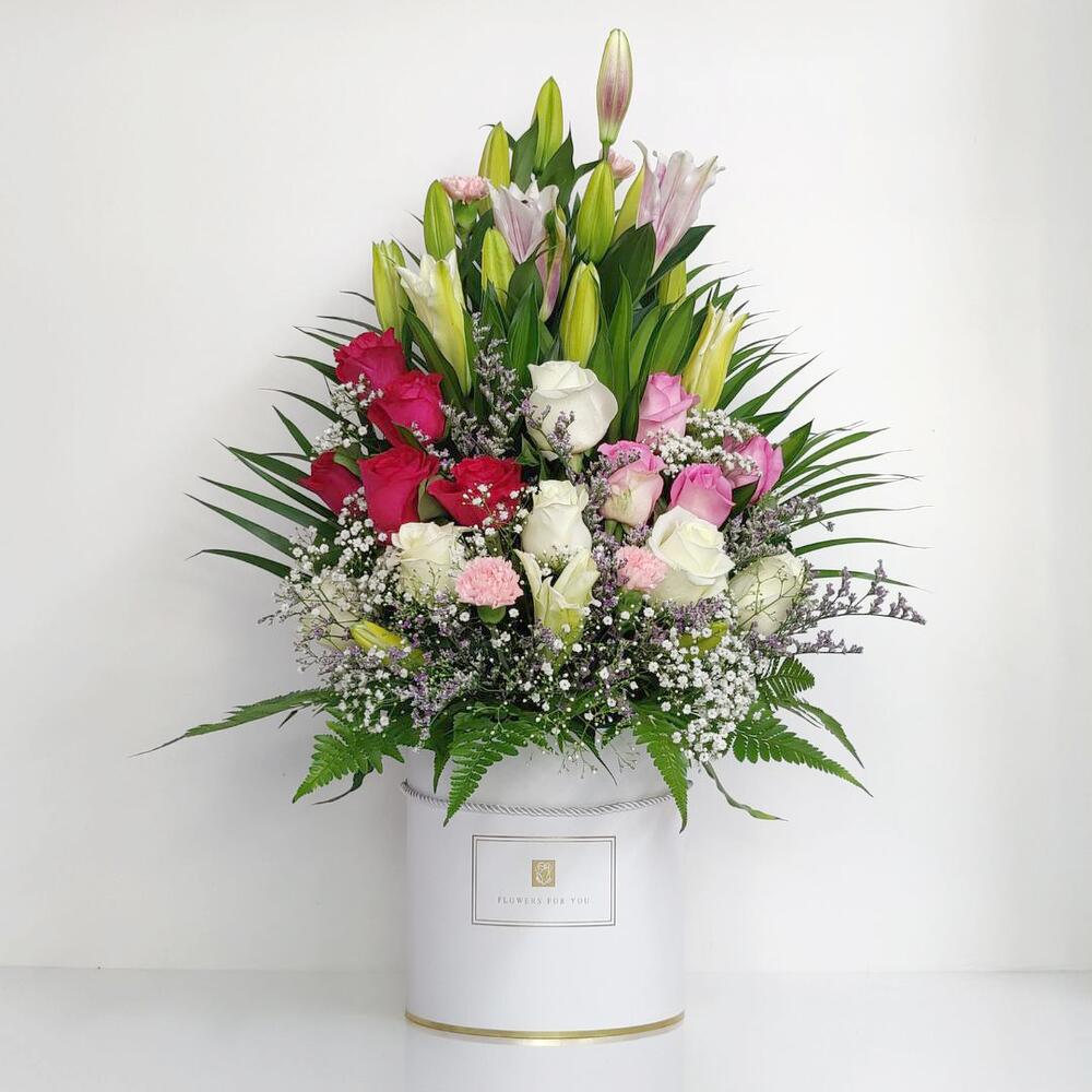 Элегантная композиция в коробке из лилий и роз с зеленью гипсофила