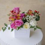 Композиция в белой кубической коробке: 5 стеблей розовых роз, 3 стебля альстромерии, 2 стебля красного гиперикума и 2 стебля белой гвоздики