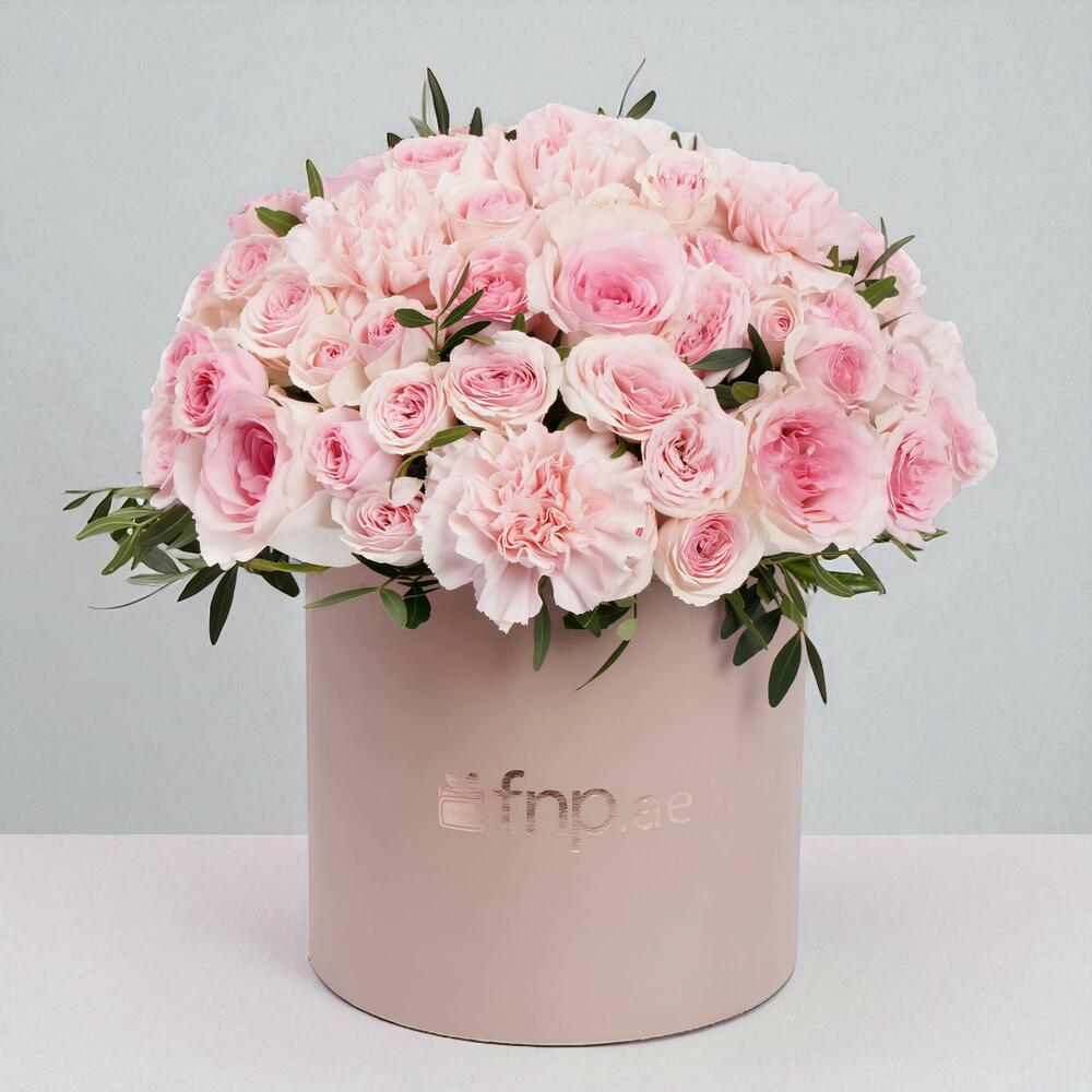 Красивая круглая коробка с 7 розовыми гвоздиками, 7 розовыми розами Мандала и 5 розовыми кустовыми розами, продуманно оформленная, чтобы ваша мама почувствовала себя особенной в её день.