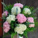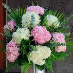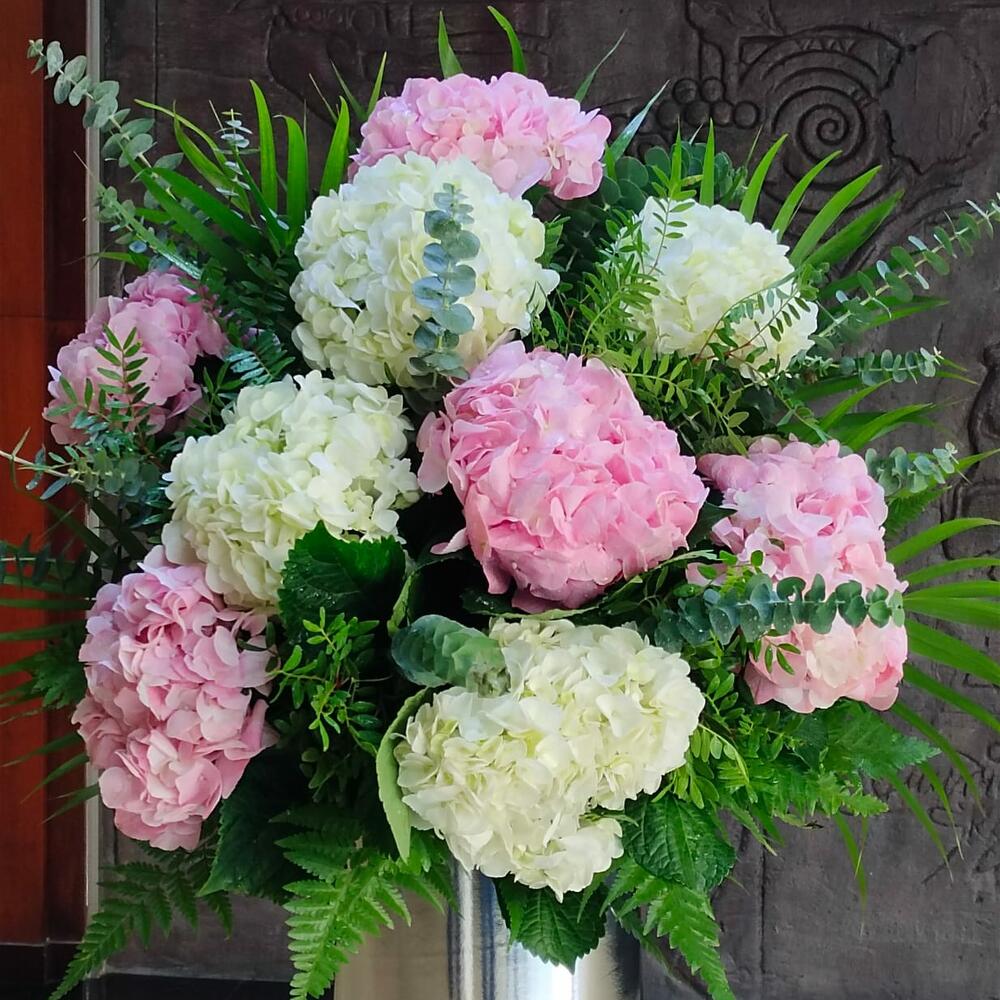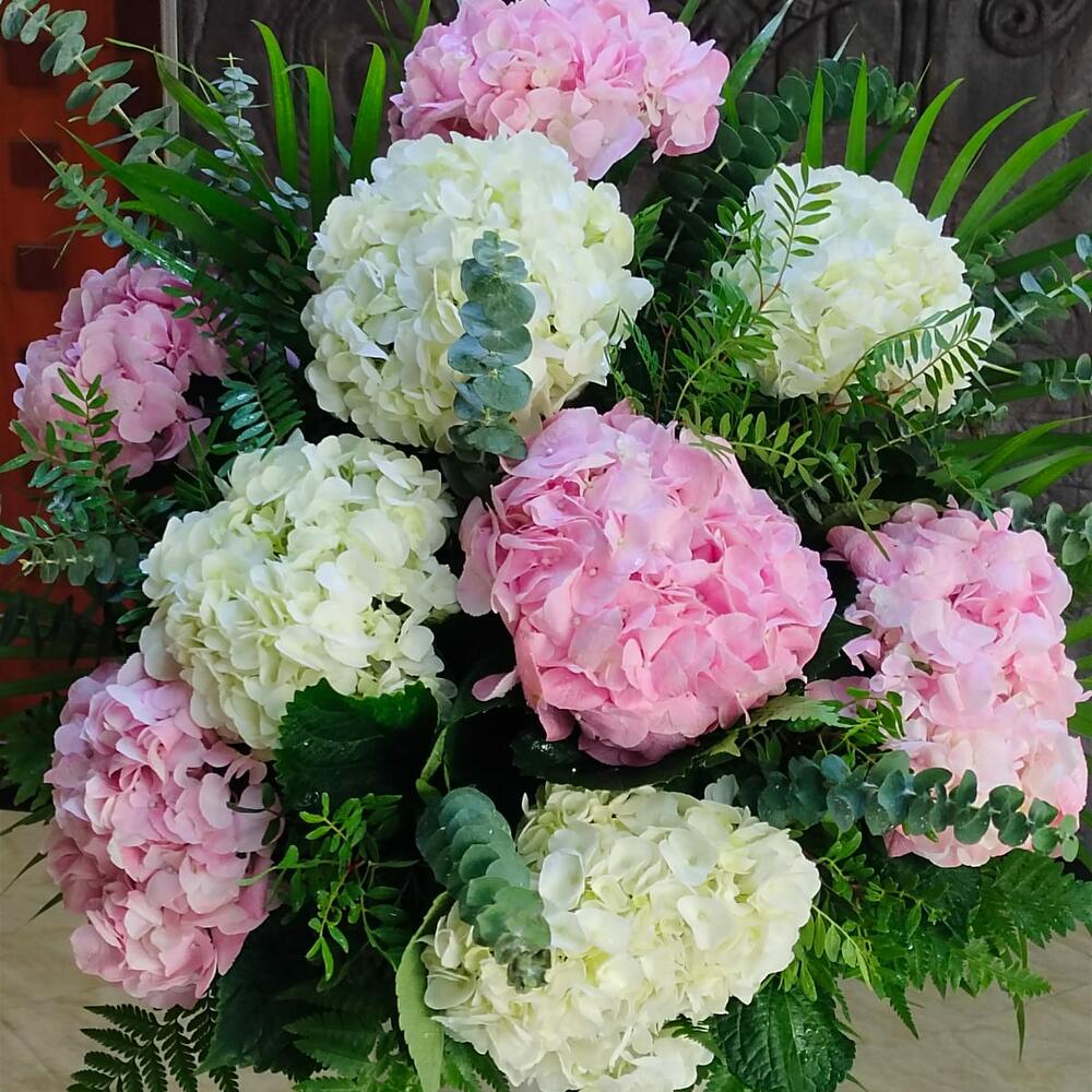 white hydrangea - 4 шт. pink hydrangea - 5 шт. euclyptus - 4 шт. пальма арека - 4 шт.