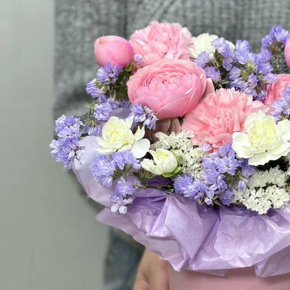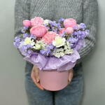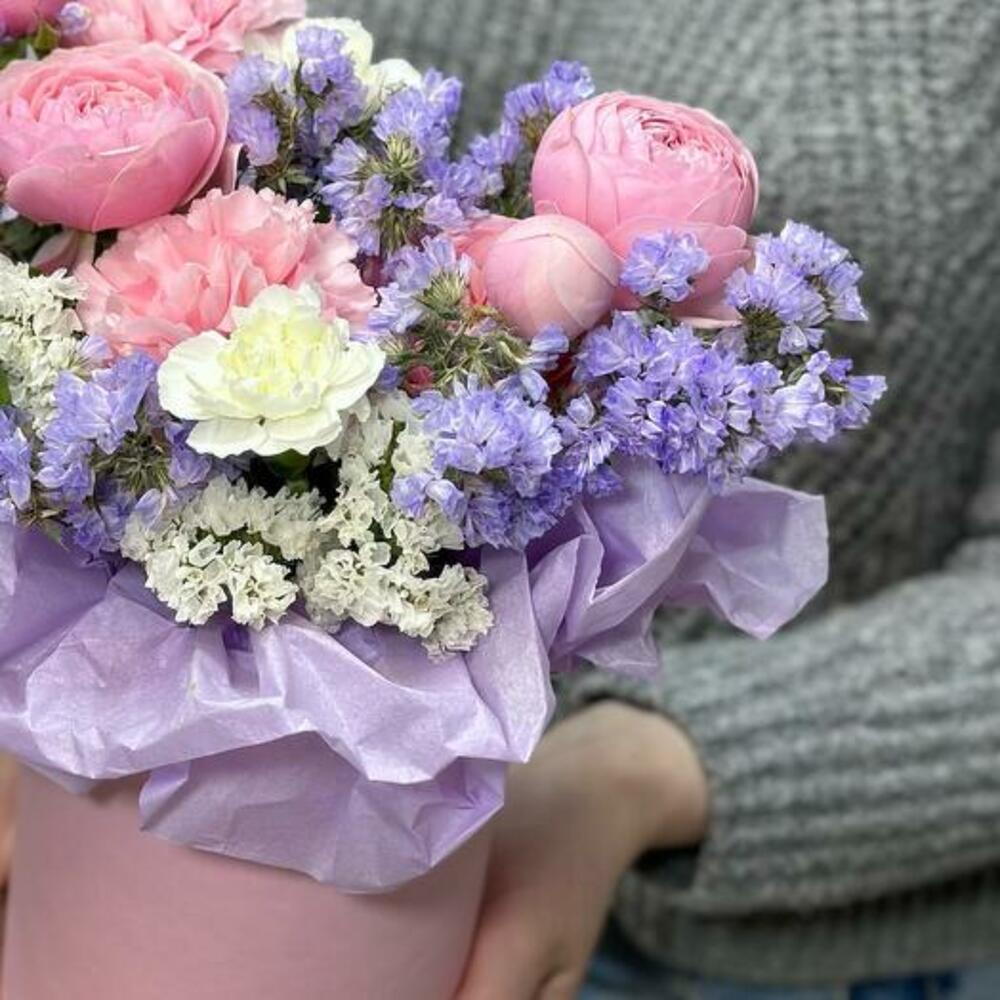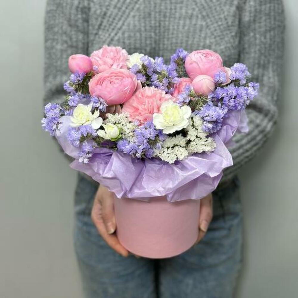 Hatbox - 1 шт. carnation white - 1 шт. dianthus pink - 2 шт. цветочный оазис - 1 шт. white statice - 1 шт. лиловая статица - 1 шт.
