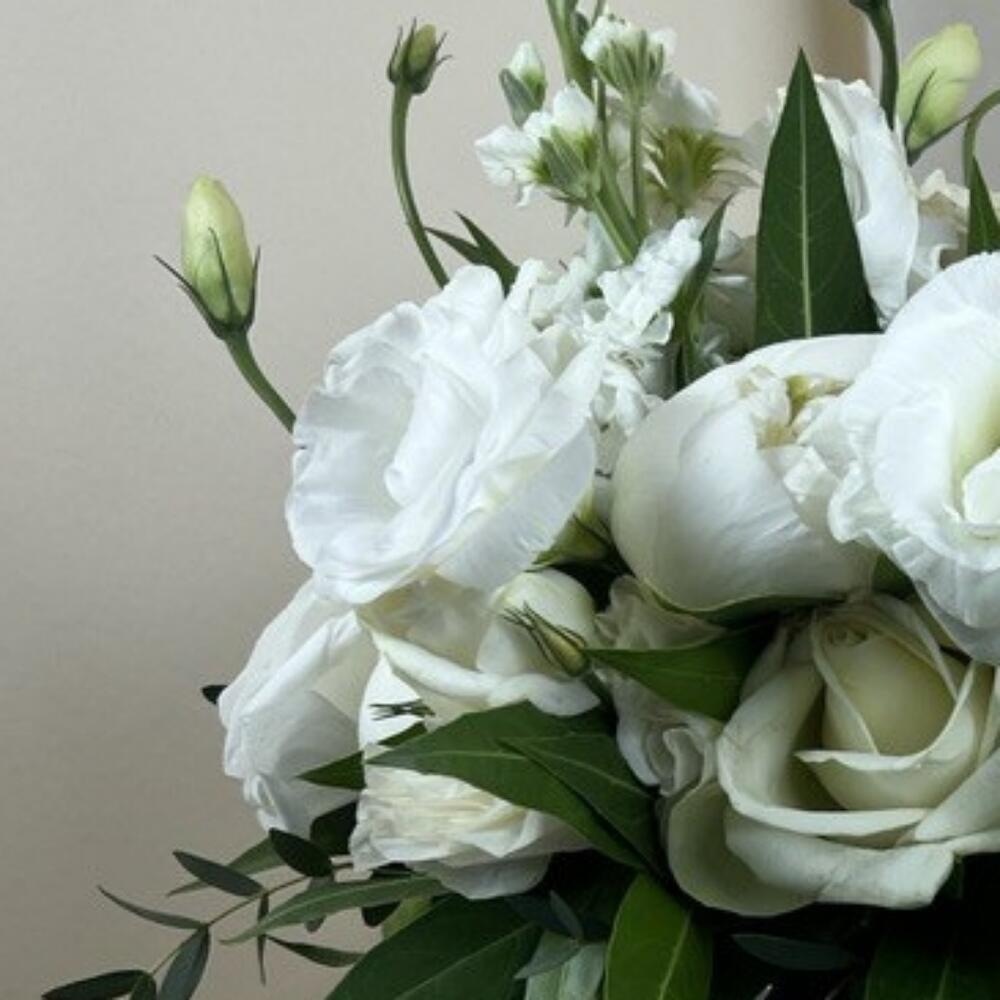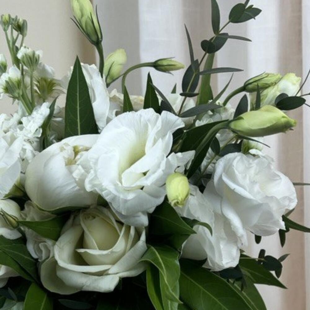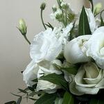 Eucalyptus - 4 шт. Lisianthus - 3 шт. rose - 3 шт. piones - 5 шт. matthiola - 2 шт.