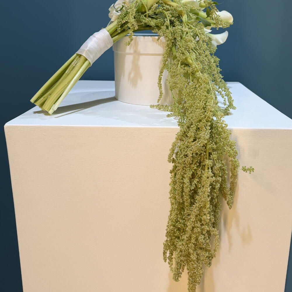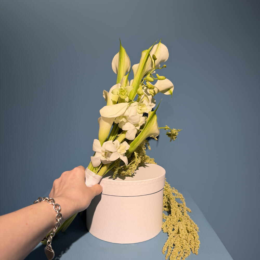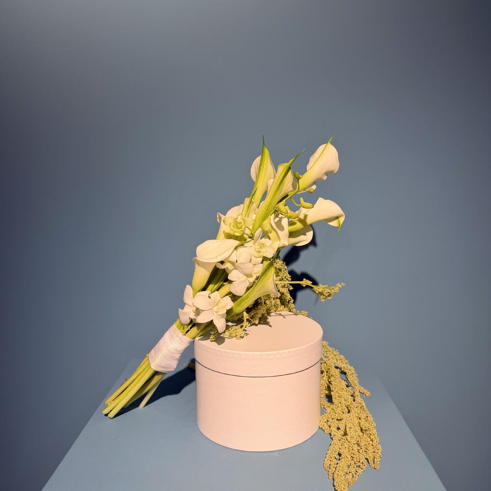 Скульптурные белые каллы дополнены мягкими, струящимися акцентами, чтобы создать современный свадебный образ — чистый, продуманный и непринуждённо грациозный. Создано для невесты, которая ценит минимализм, красоту и тихую роскошь. Идеально для утренних свадебных сборов, гражданских церемоний, свадебных портретов или камерных торжеств.