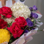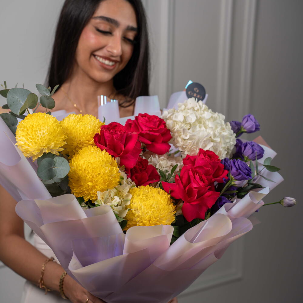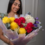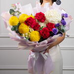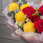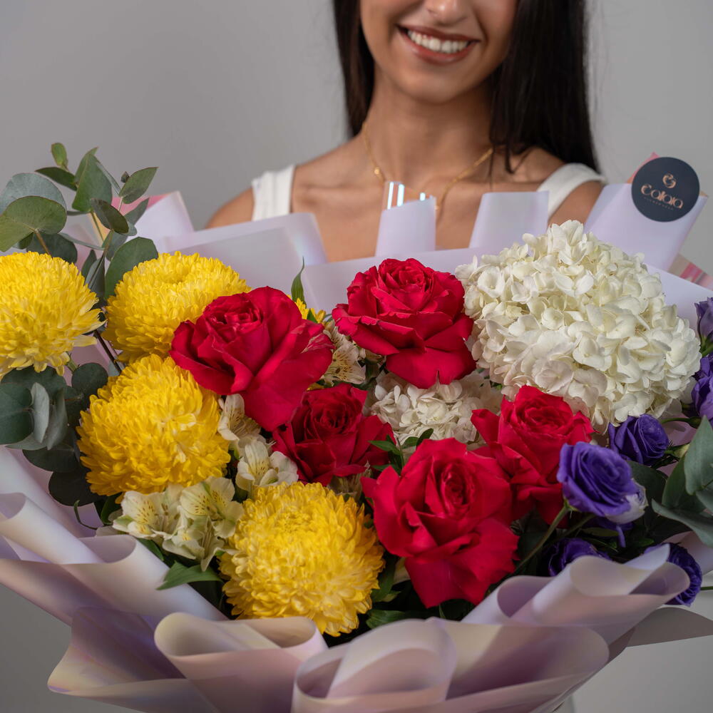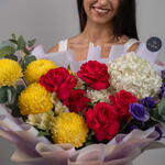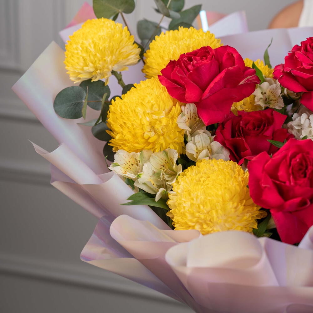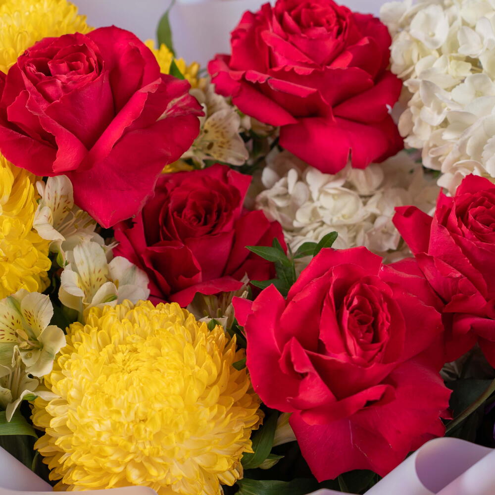 Яркий микс – насыщенный букет из красных, жёлтых и белых цветов Яркий микс – это яркий букет, собранный вручную, полный жизни и красок, созданный, чтобы сделать каждое мгновение незабываемым. Эта жизнерадостная композиция включает жёлтые пионы-хризантемы, розы цвета фуксии, фиолетовую эустому и белую гортензию, а альстромерии и эвкалипт дополняют композицию, придавая ей баланс и свежесть. Этот радостный подарок излучает энергию, элегантность и очарование.