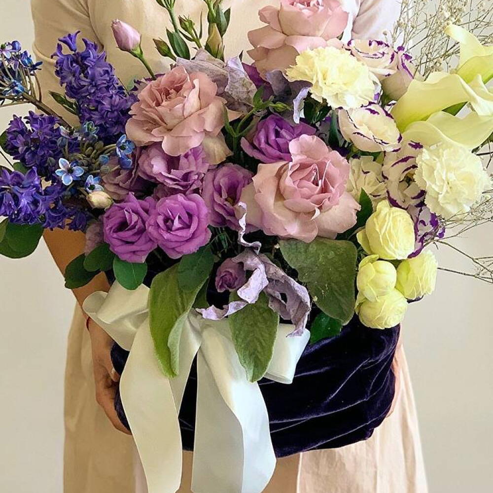 Composition: Hyacinth - 4, Rose Ecuador Faith light purple - 3, Calla - 3, Rose sprey Madame Bombastic - 1, Dianthus - 3, Ornithogalum - 2, Eucalyptus - 1, Gypsophila - 1, Lisianthus - 2, velvet bag - 1, ribbon - 1 Sizes: WIDTH - 30CM; HEIGHT - 30CM; LENGTH - 30CM; (including packaging) Размер: 30 x 30 x 30 см