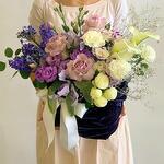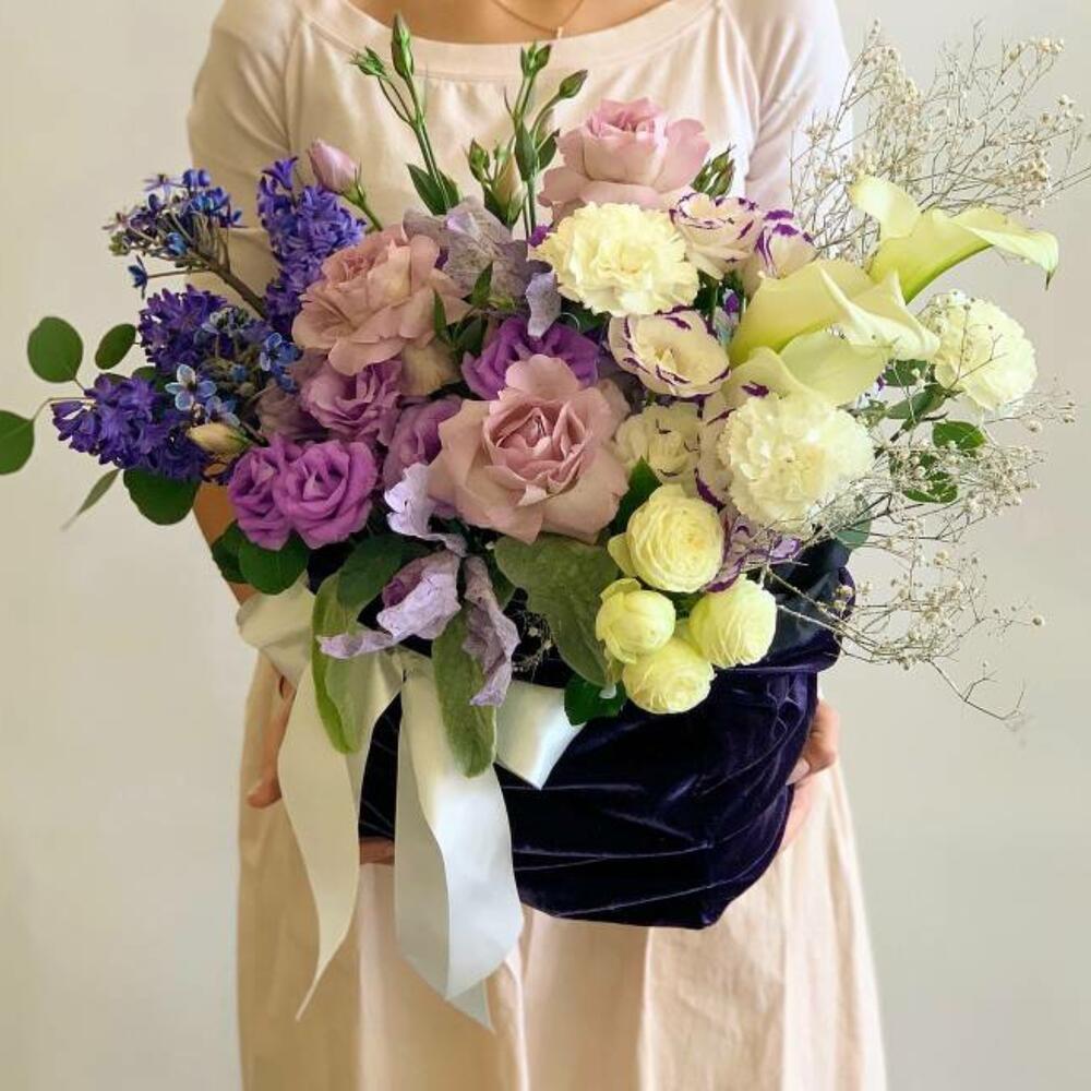 Composition: Hyacinth - 4, Rose Ecuador Faith light purple - 3, Calla - 3, Rose sprey Madame Bombastic - 1, Dianthus - 3, Ornithogalum - 2, Eucalyptus - 1, Gypsophila - 1, Lisianthus - 2, velvet bag - 1, ribbon - 1 Sizes: WIDTH - 30CM; HEIGHT - 30CM; LENGTH - 30CM; (including packaging) Размер: 30 x 30 x 30 см